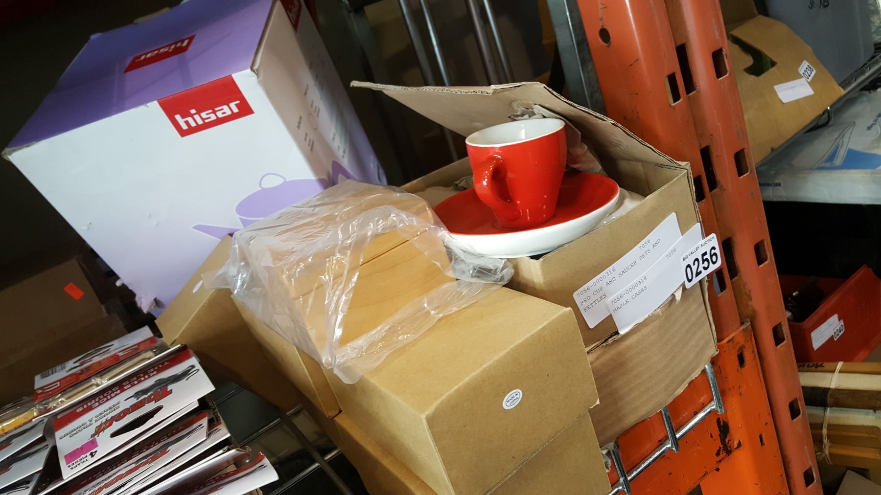 RED CUP AND SAUCER SETS AND KETTLES AND MAPLE CASES