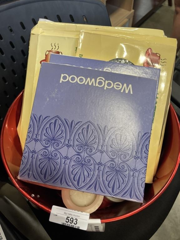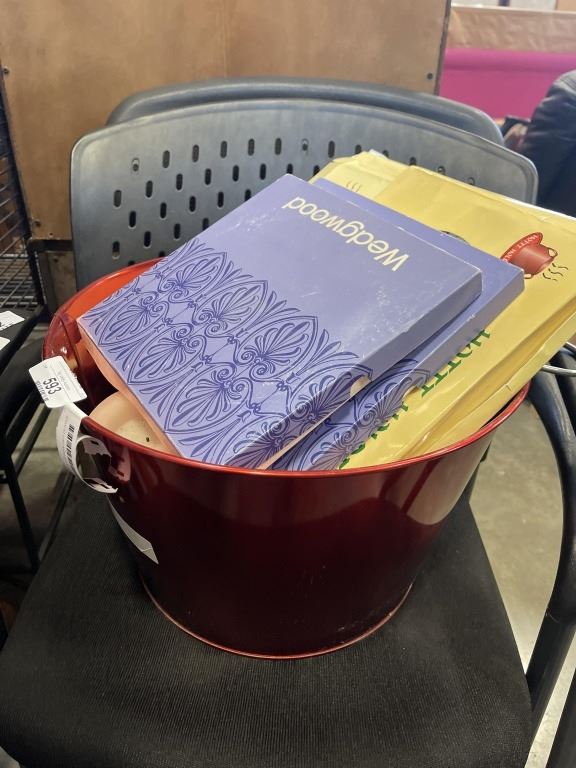 RED METAL BIN WITH NEW HOT PLATES, WEDGWOD PLATES, CANDLES ETC