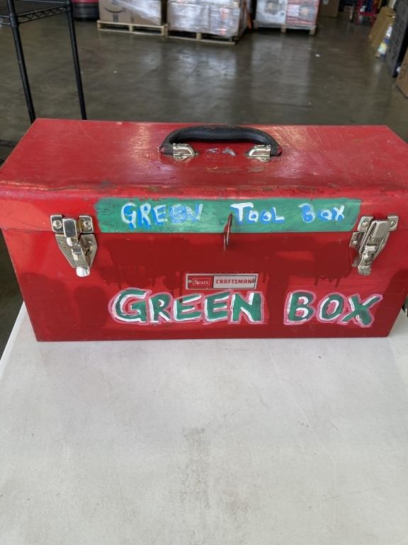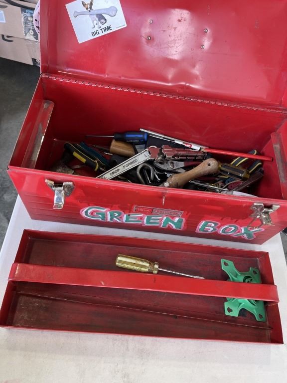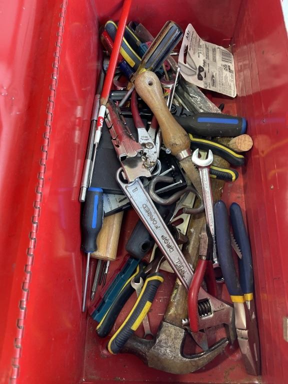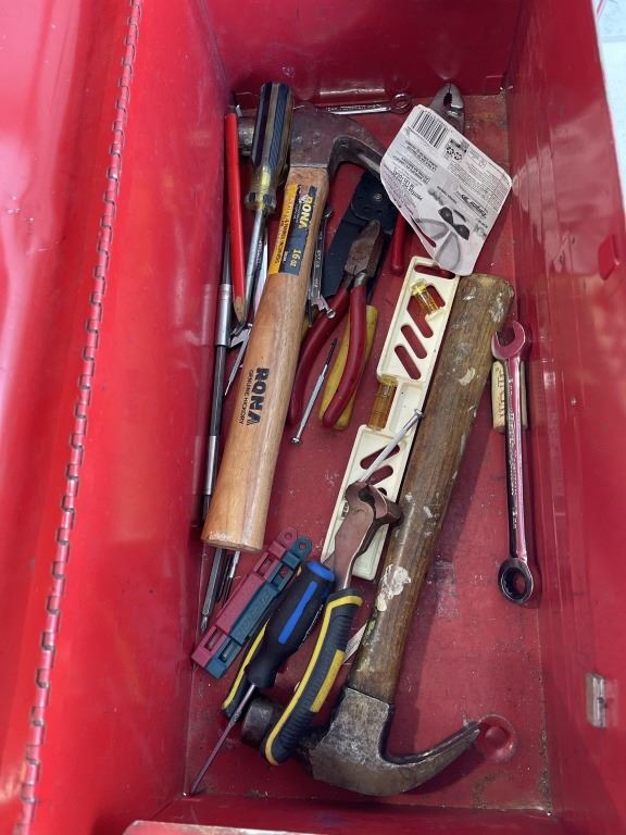 RED METAL TOOLBOX AND ASSORTED HAND TOOLS