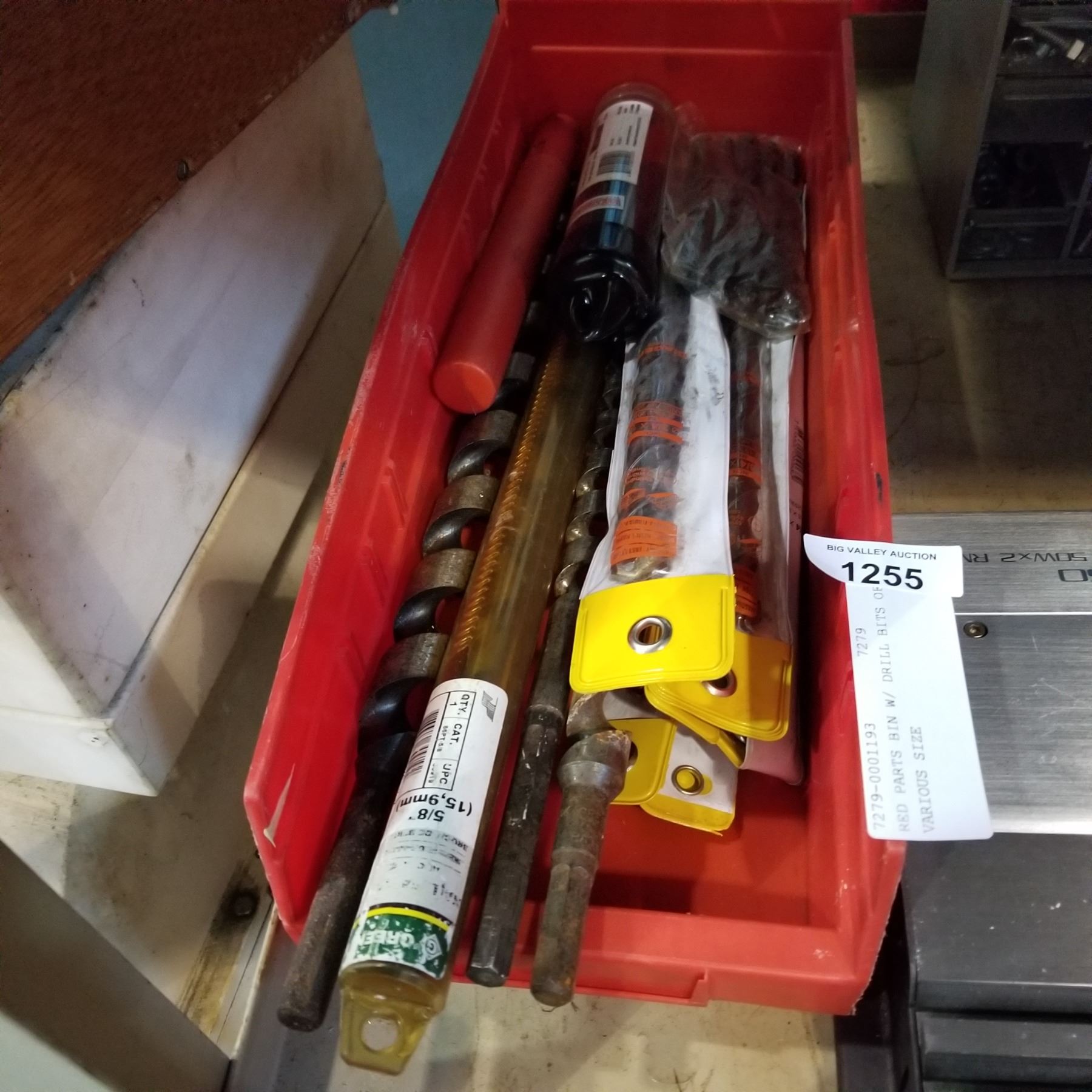 RED PARTS BIN W/ DRILL BITS OF VARIOUS SIZE