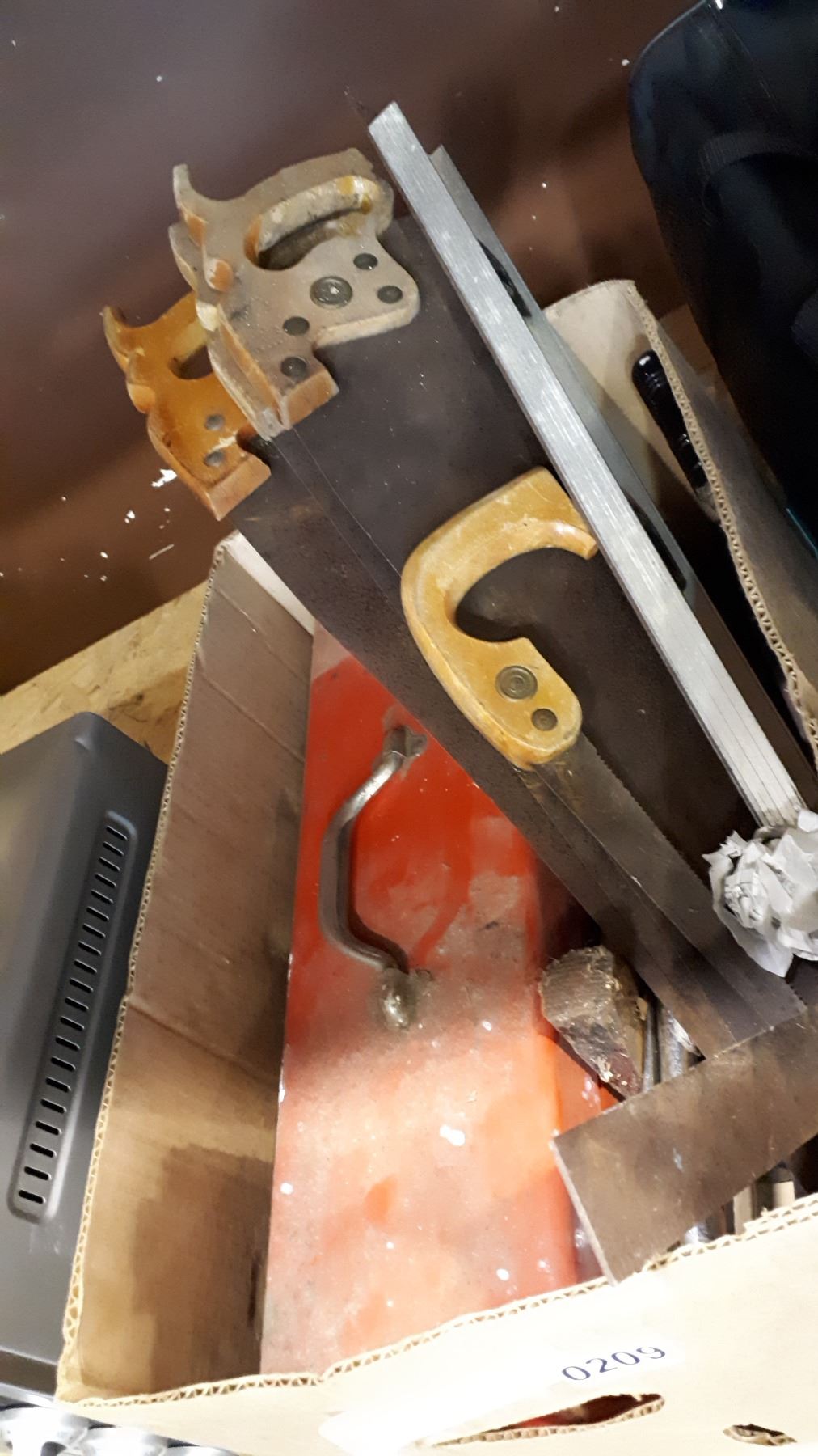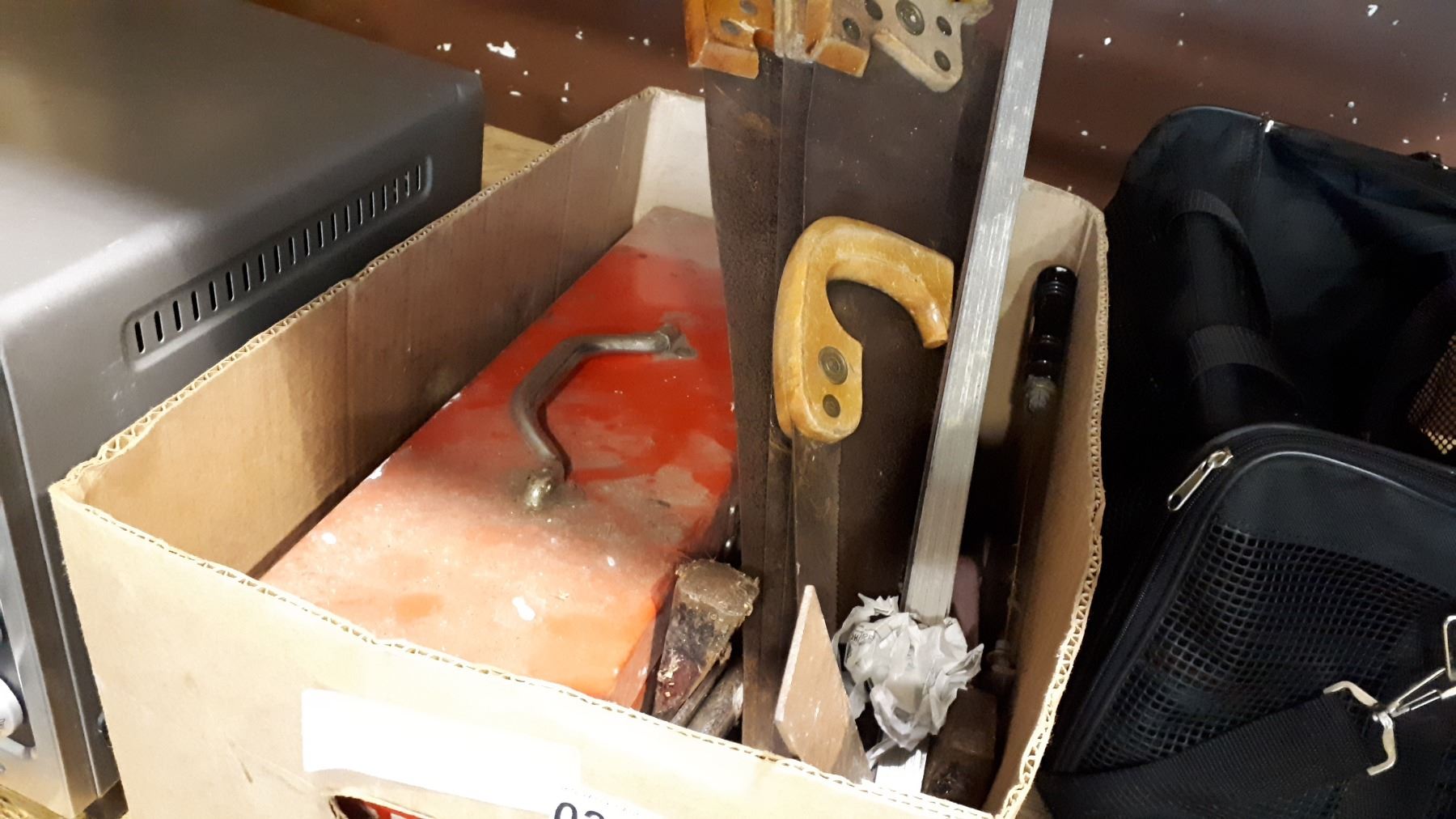RED TOOL BOX AND BOX LOT OF SAWS ETC