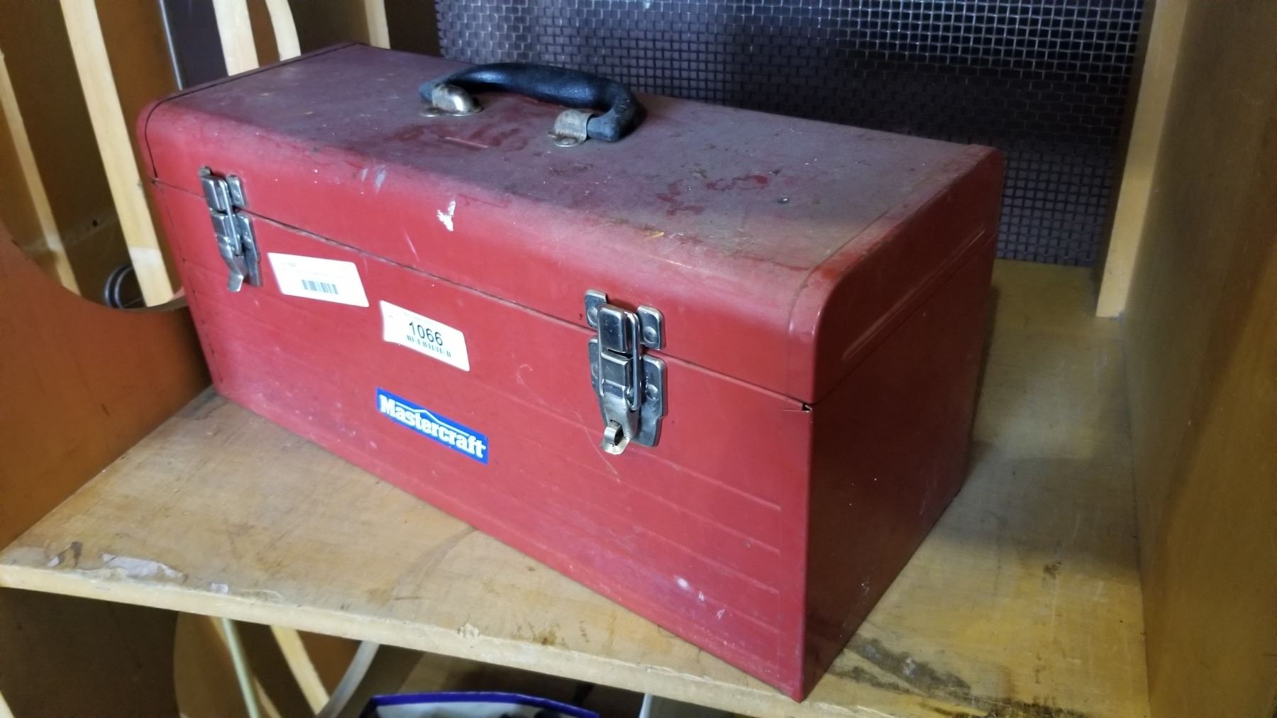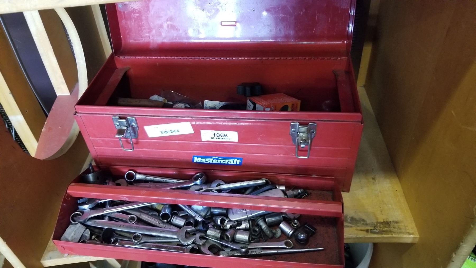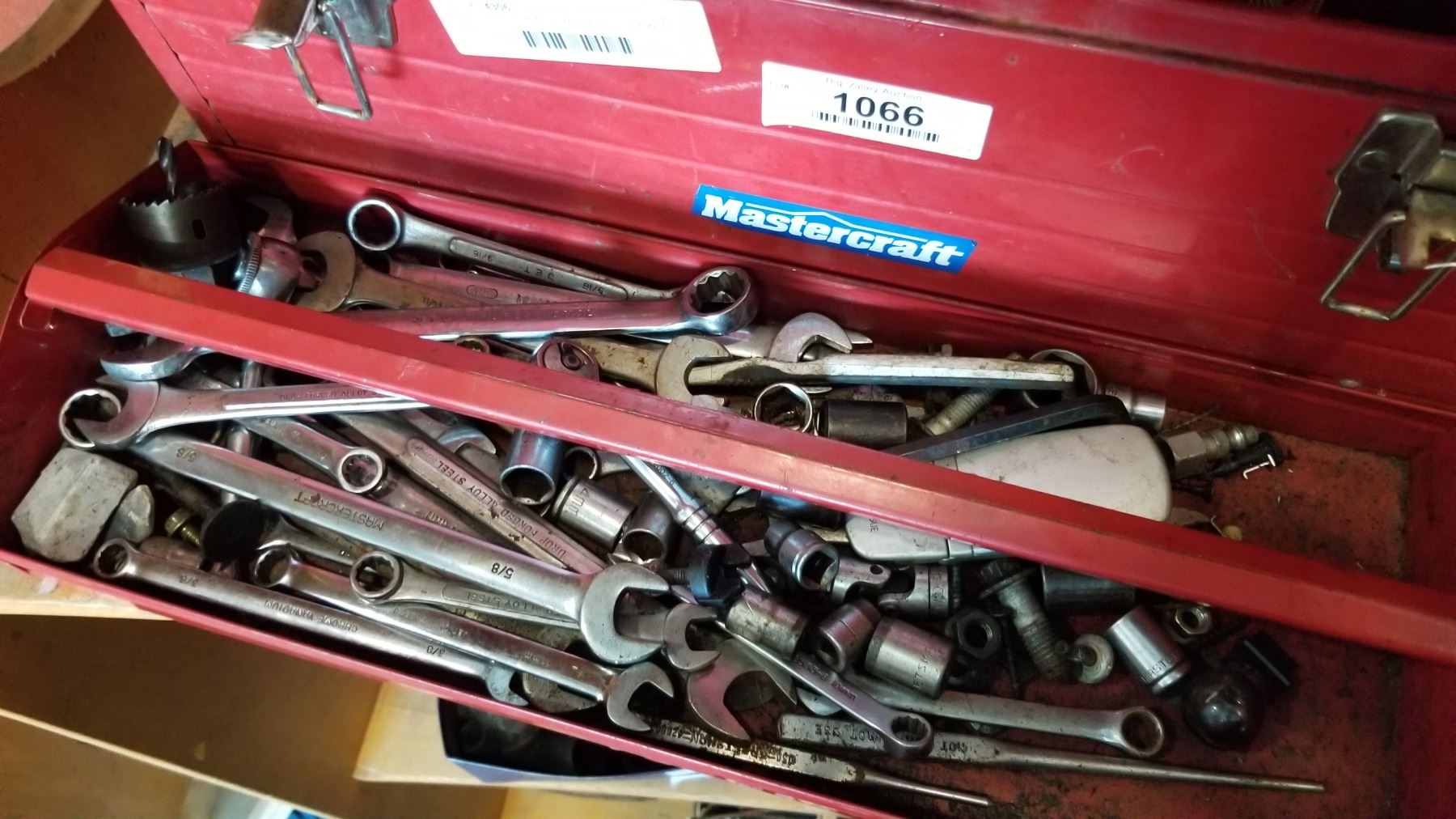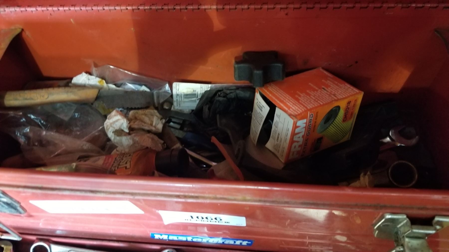 RED TOOLBOX WITH WRENCHES, SOCKETS AND SHOP SUPPLIES