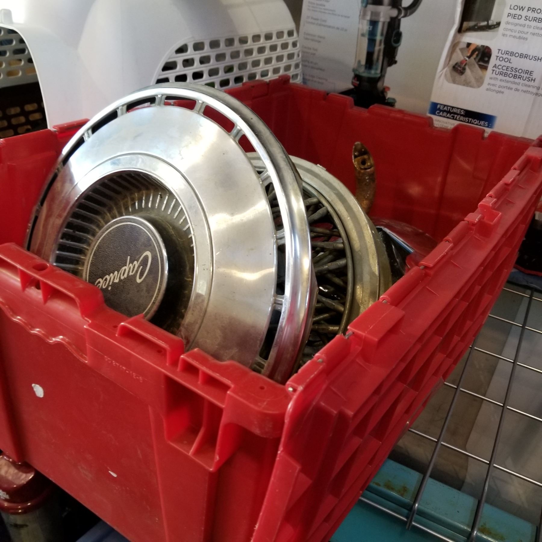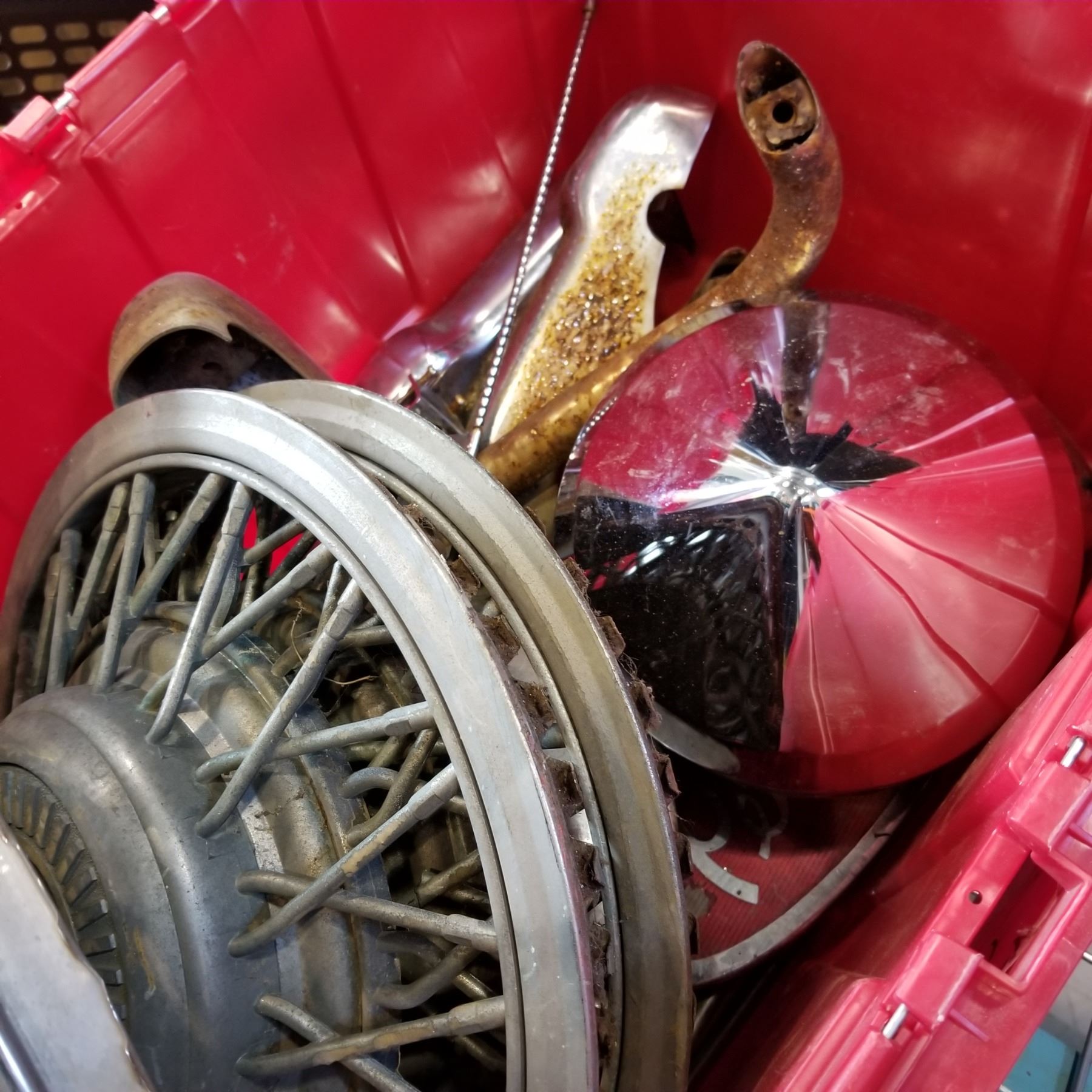 RED TOTE OF VINTAGE CAR PARTS, CARDILLAC HUB CAPS