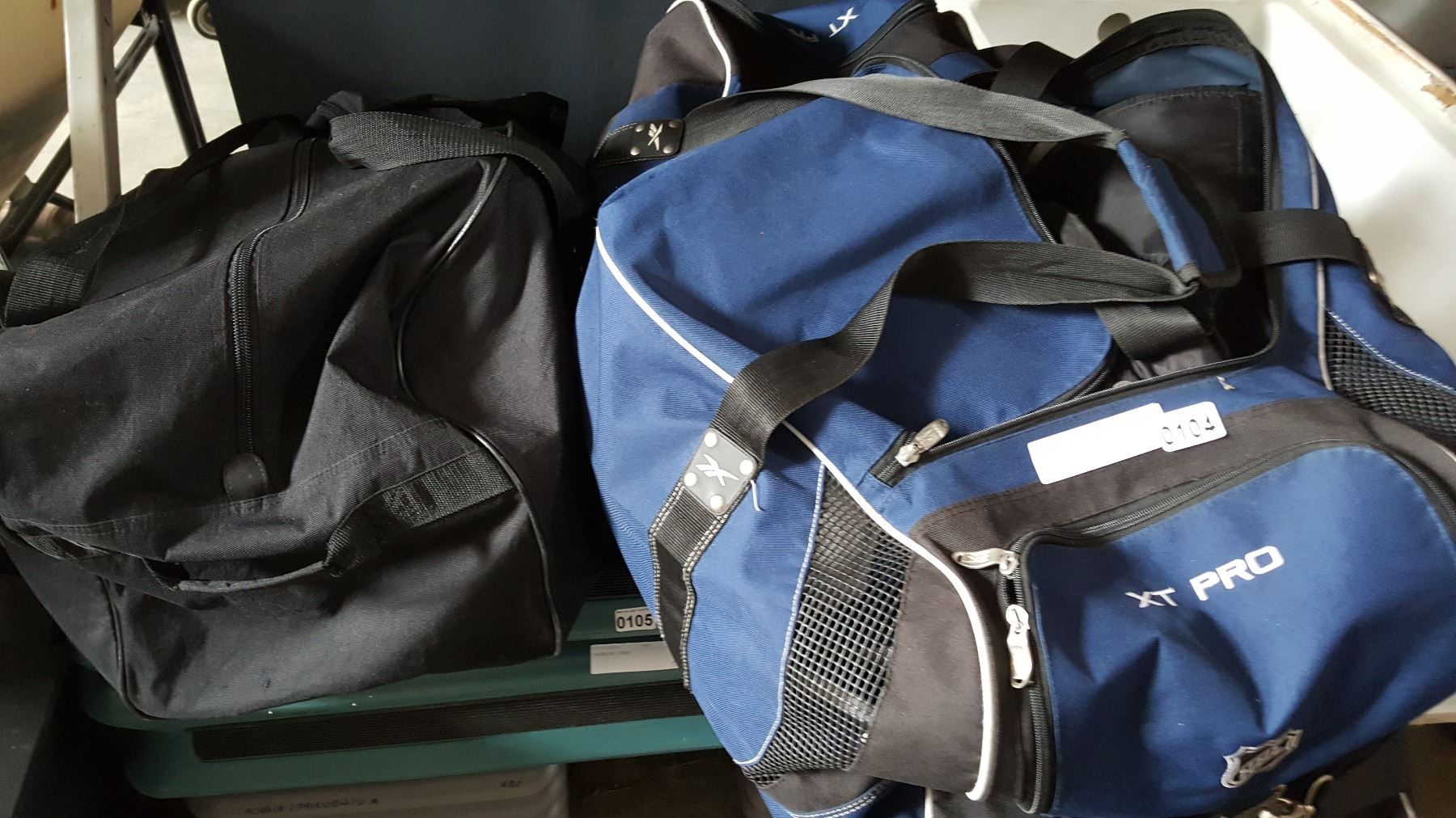 REEBOK ROLLING BAG AND BLACK BAG W/ OUTDOOR GOALIE PADS