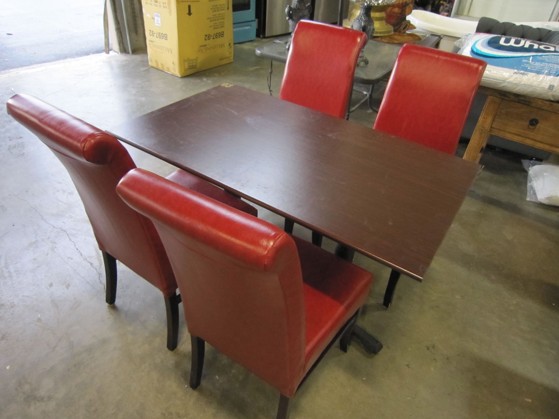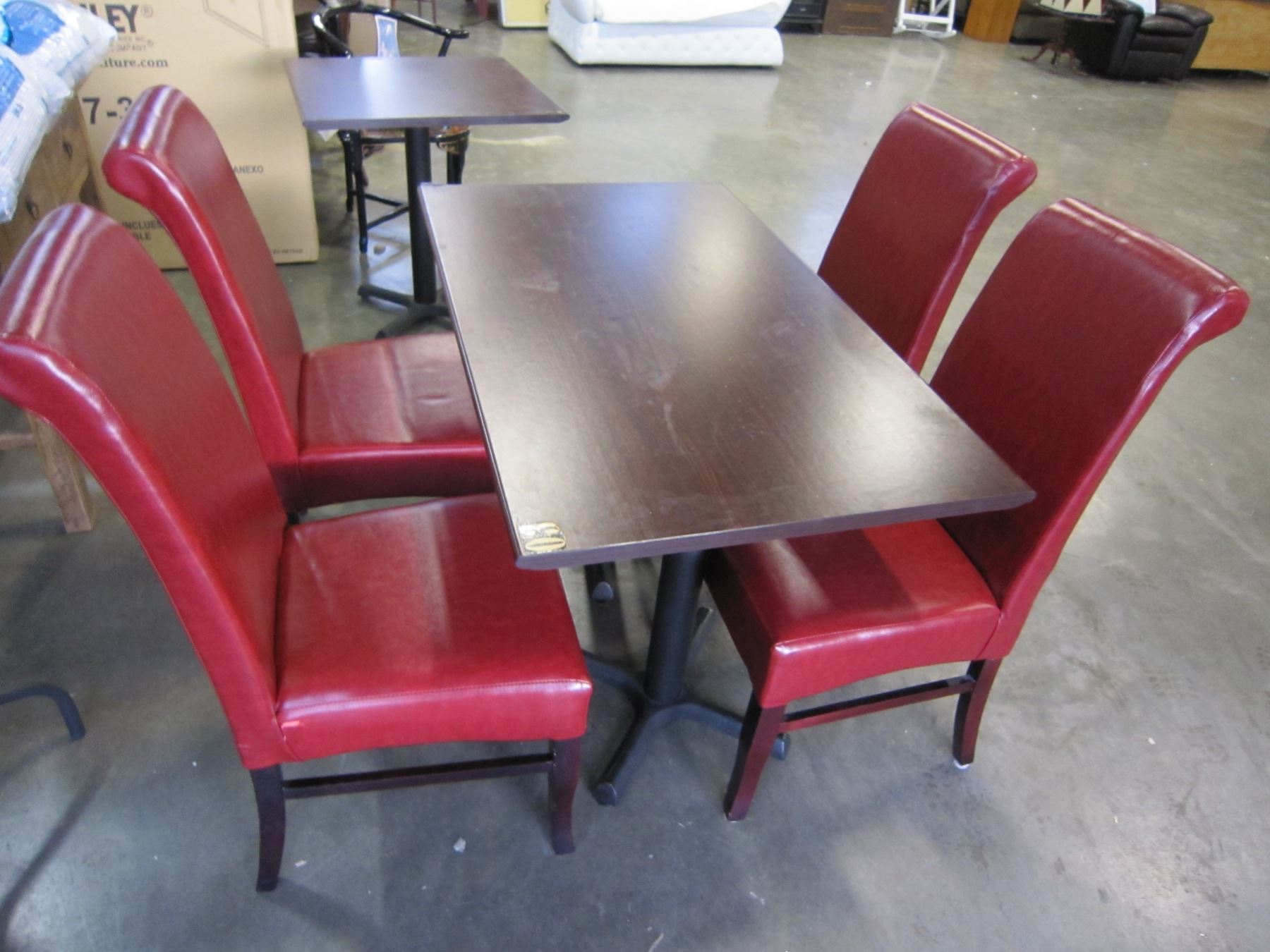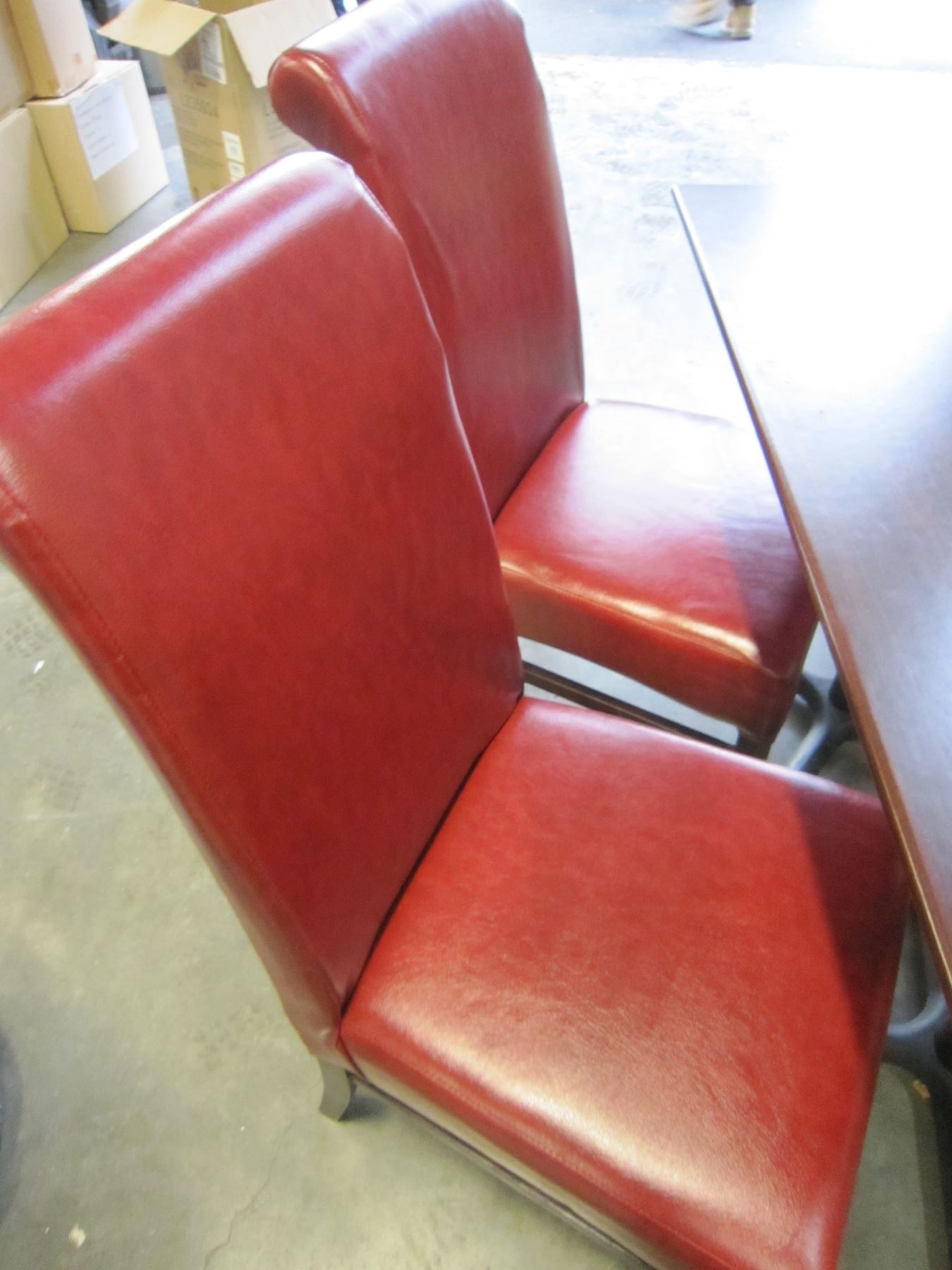 RESTAURANT TABLE WITH CAST IRON BASE, AND 4 RED LEATHER DINING CHAIRS
