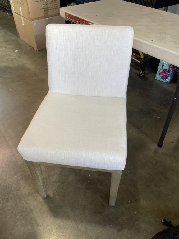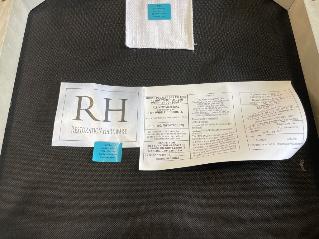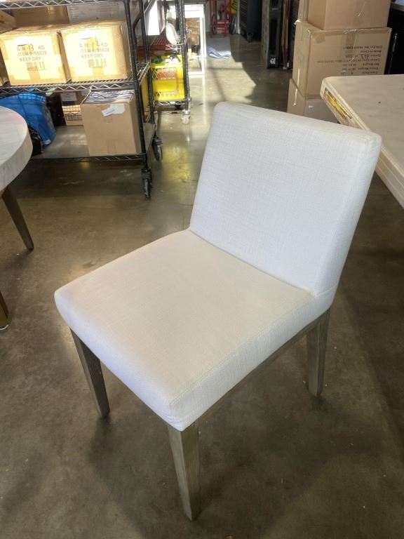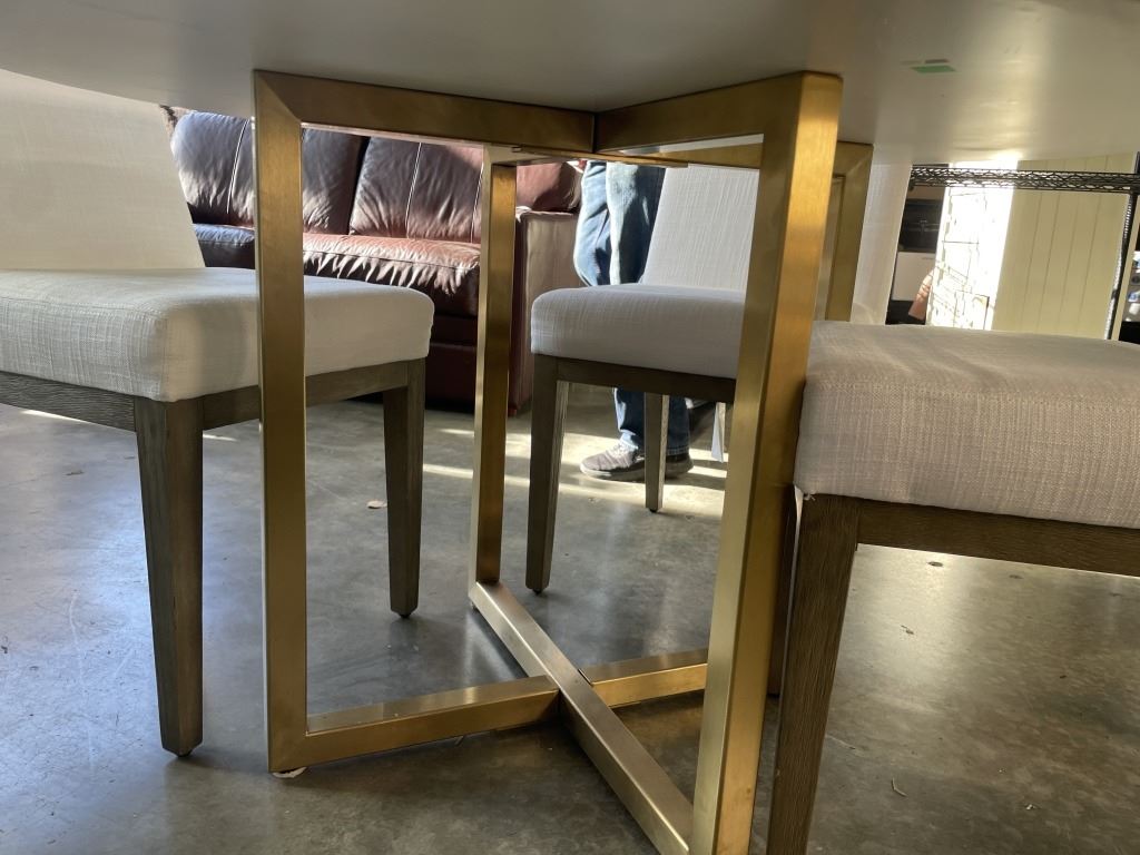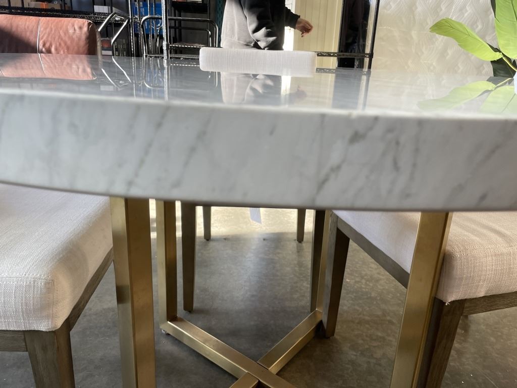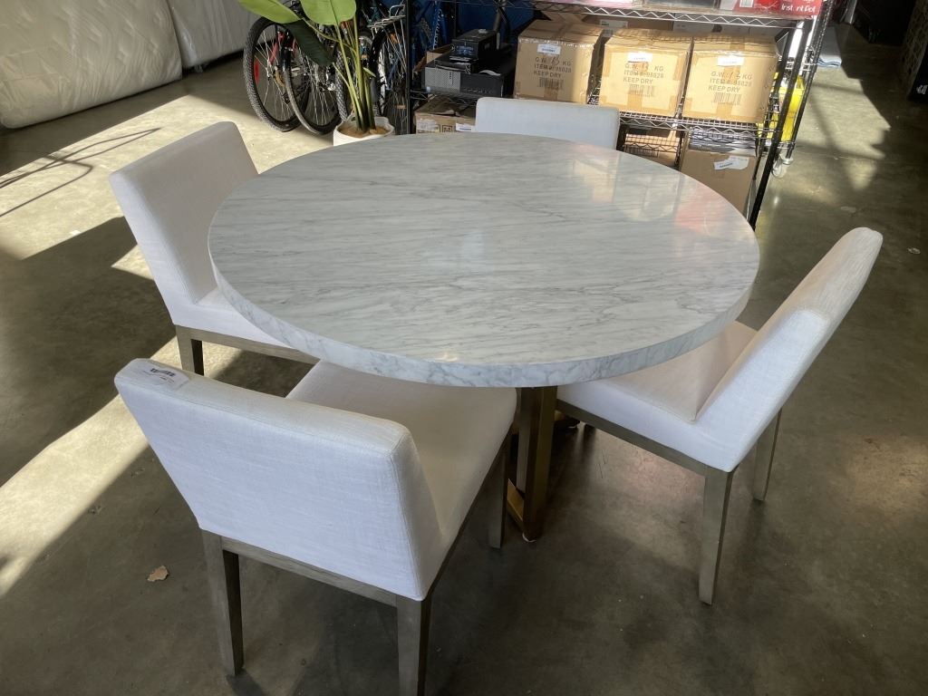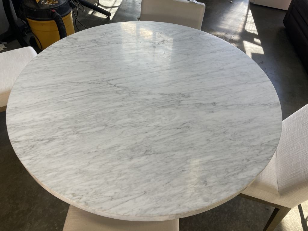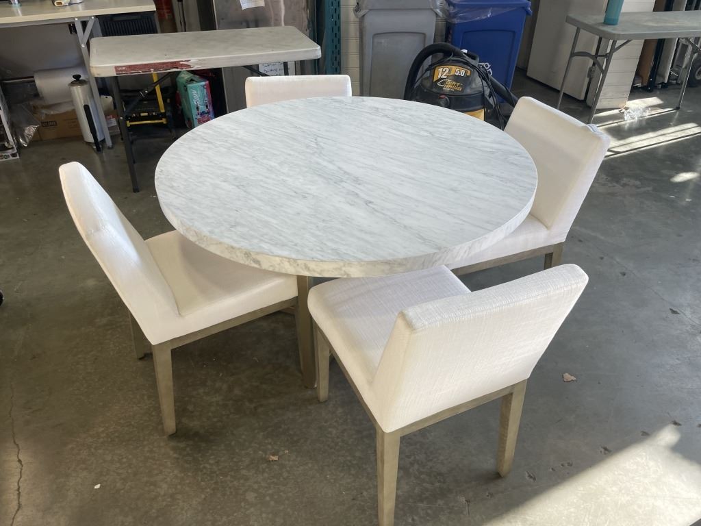 RESTORATION HARDWARE ROUND MARBLE TABLE WITH 4 UPHOLSTERED CHAIRS, 48 INCH DIAMETER