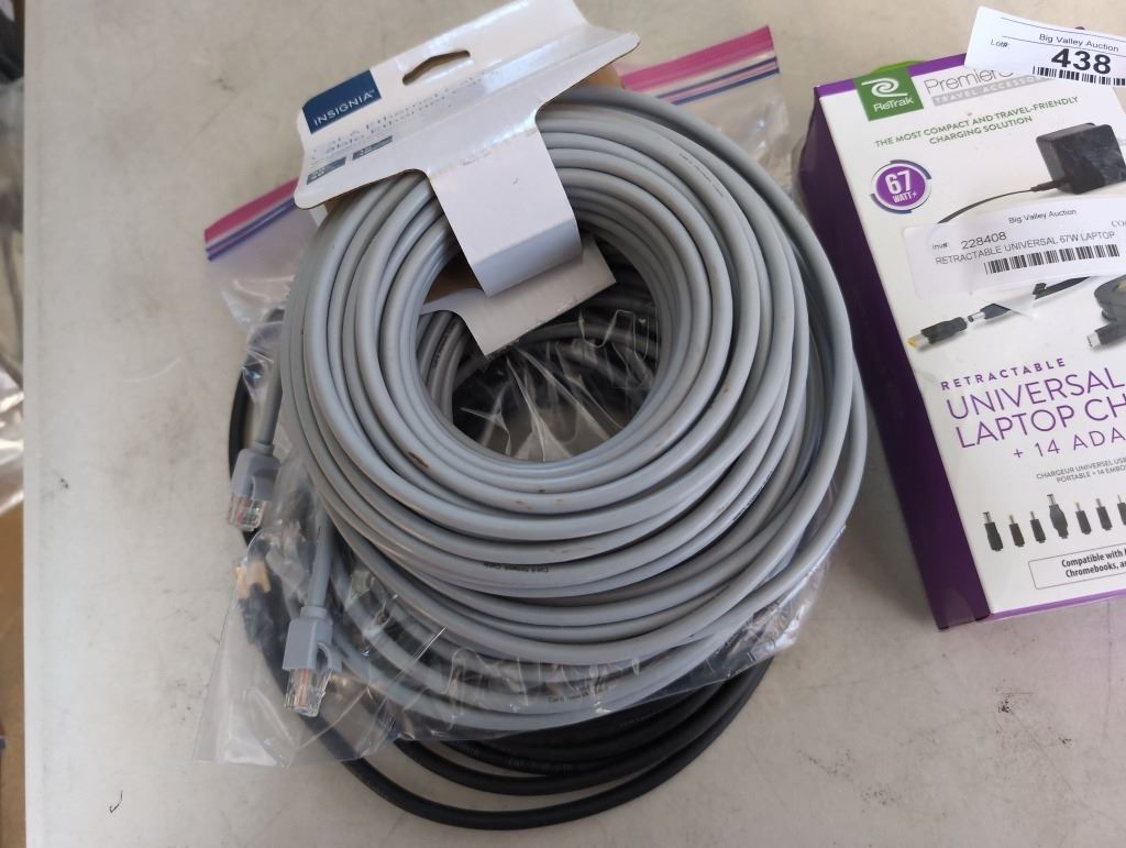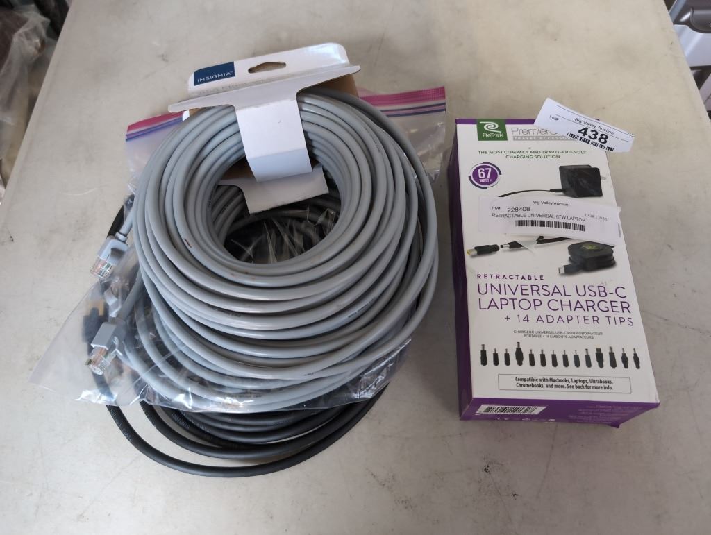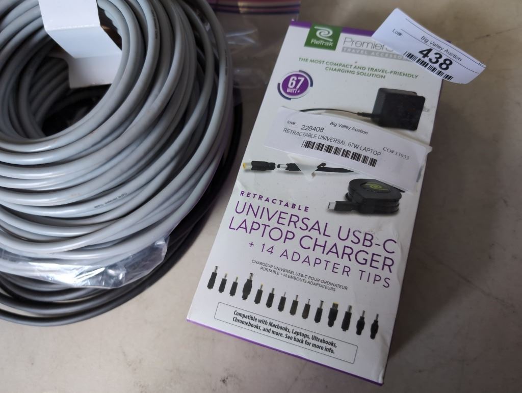 RETRACTABLE UNIVERSAL 67W LAPTOP CHARGER WITH 14 ADAPTER TIPS AND CAT 6 ETHERNET CABLES