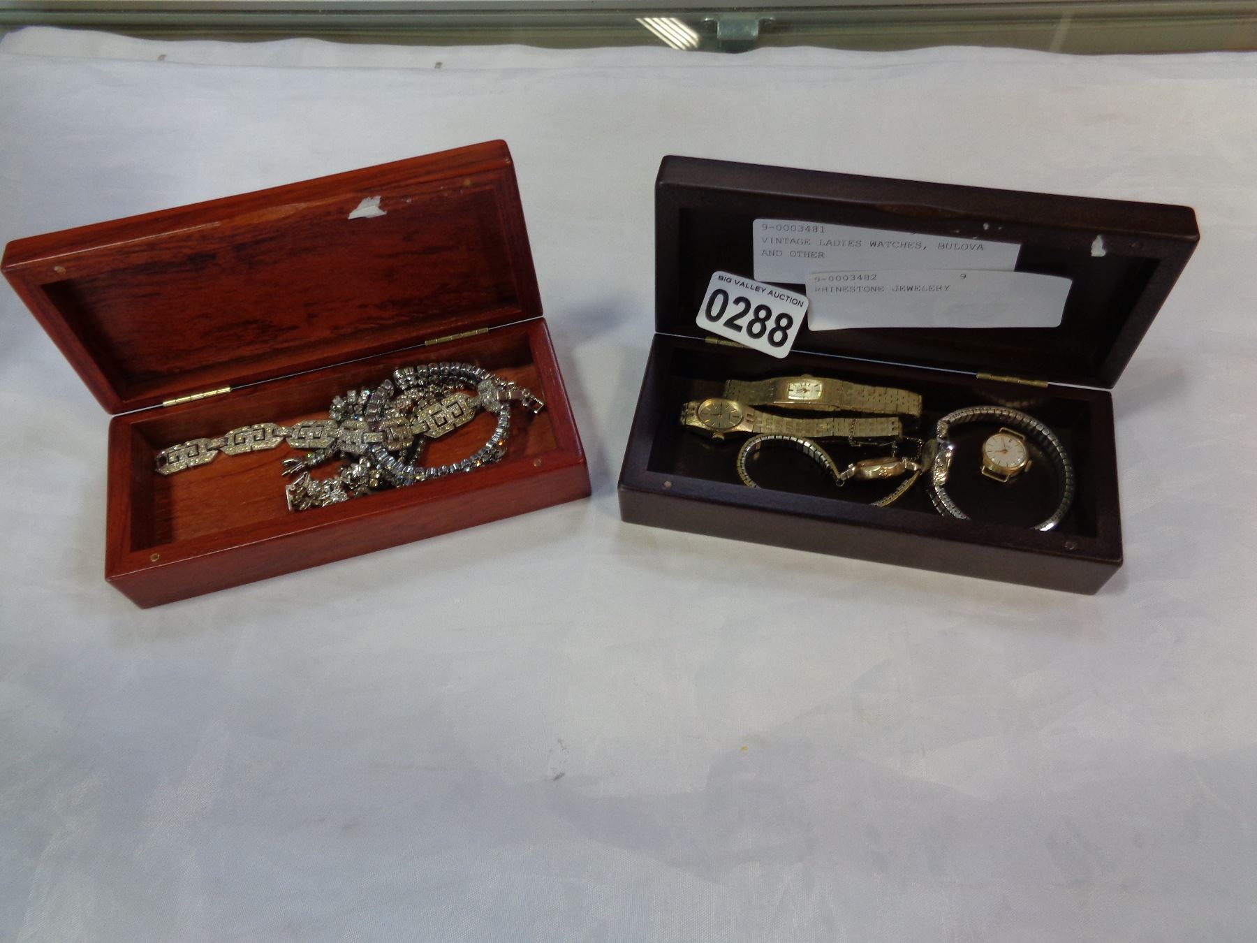 RHINESTONE JEWELERY AND VINTAGE LADIES WATCHES, BULOVA AND OTHER