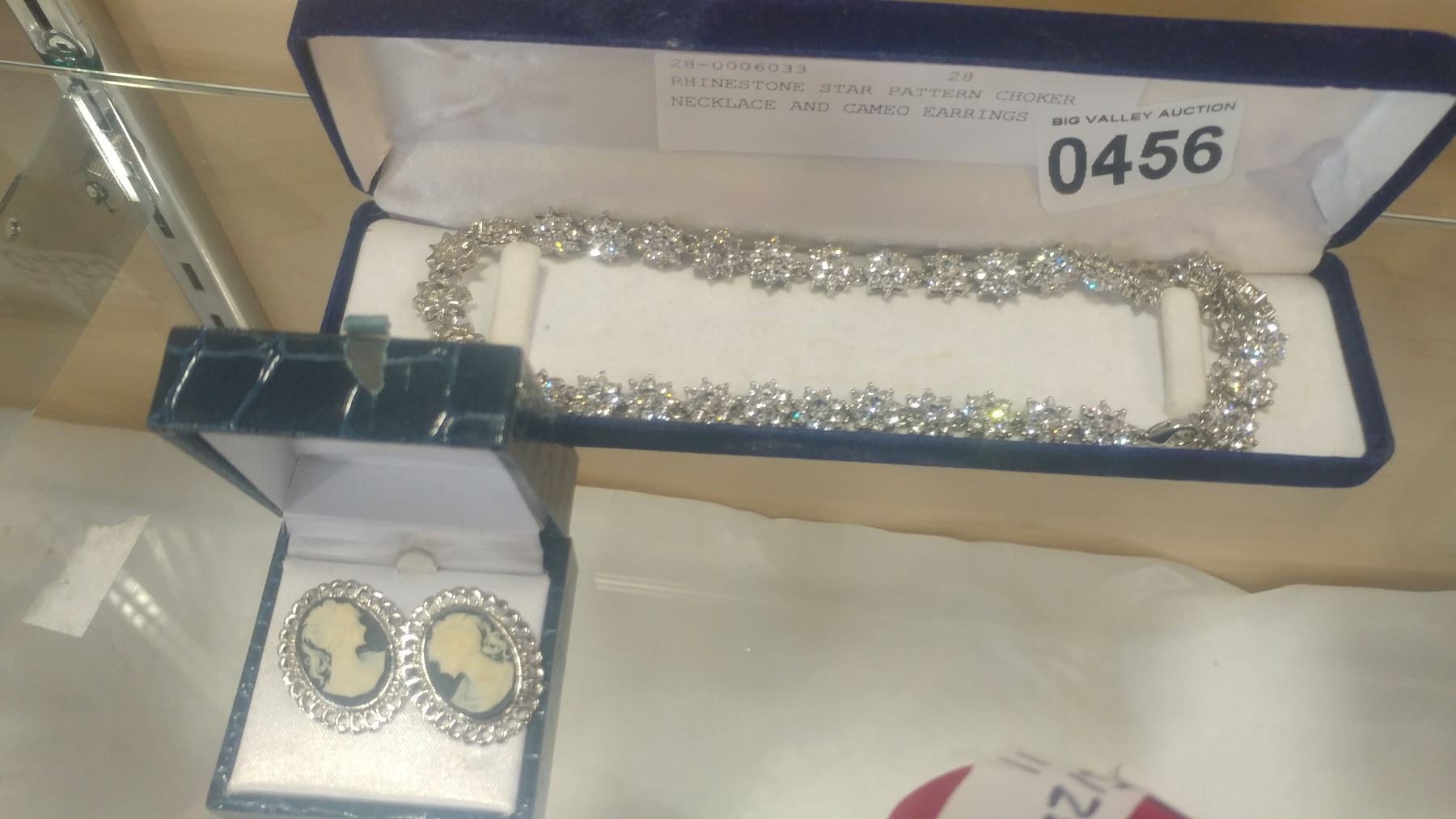 RHINESTONE STAR PATTERN CHOKER NECKLACE AND CAMEO EARRINGS