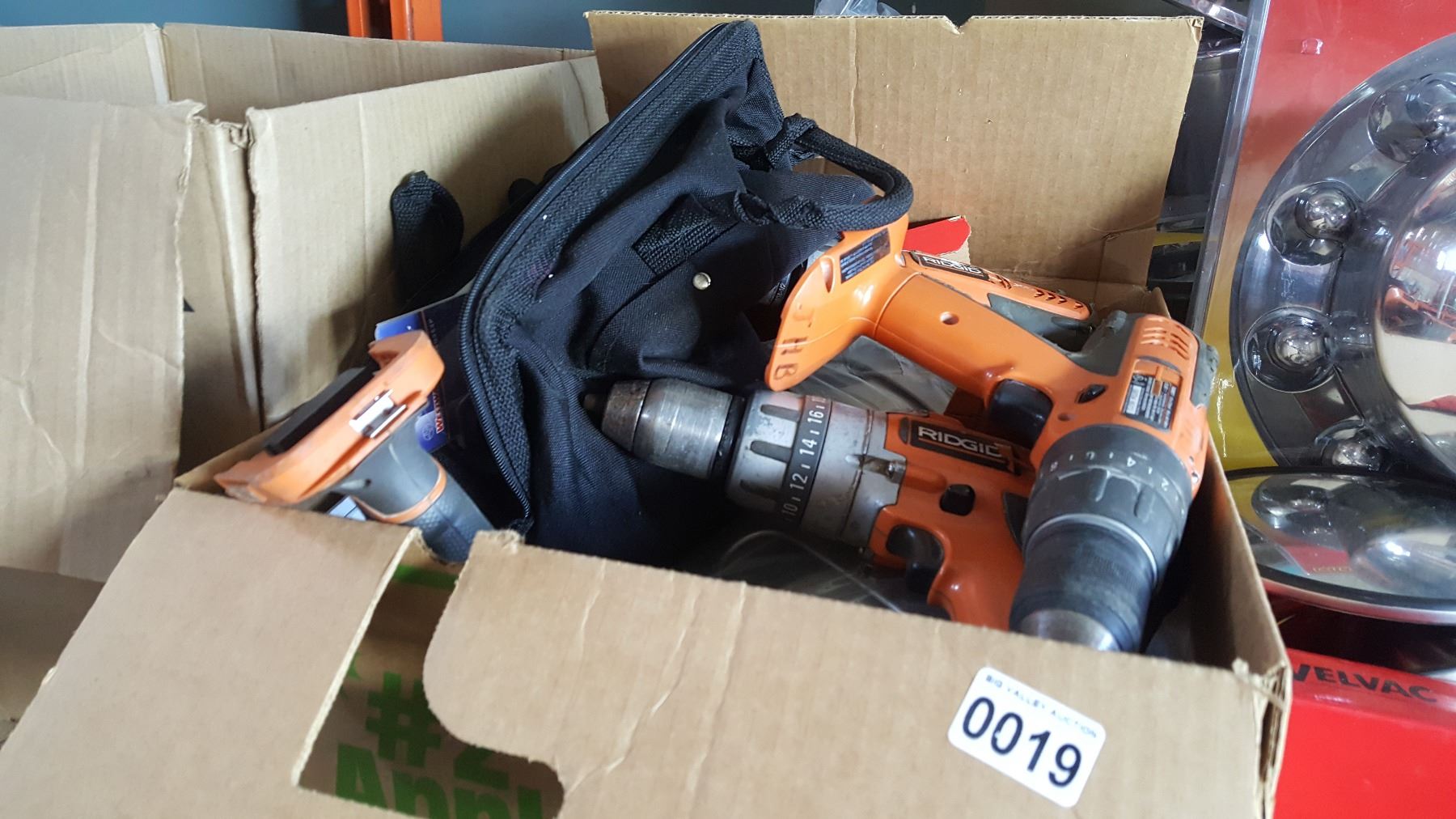RIDGID CORDLESS DRILLS AND BOX OF TOOLS AND FILTER