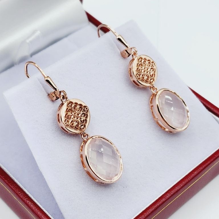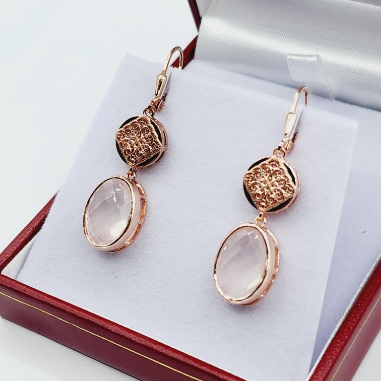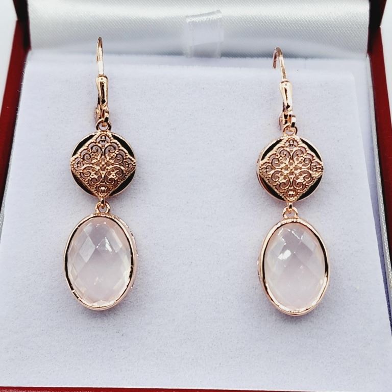 ROSE GOLD PLATED STERLING SILVER NATURAL ROSE QUARTZ EARRINGS, RETAIL $550.00.