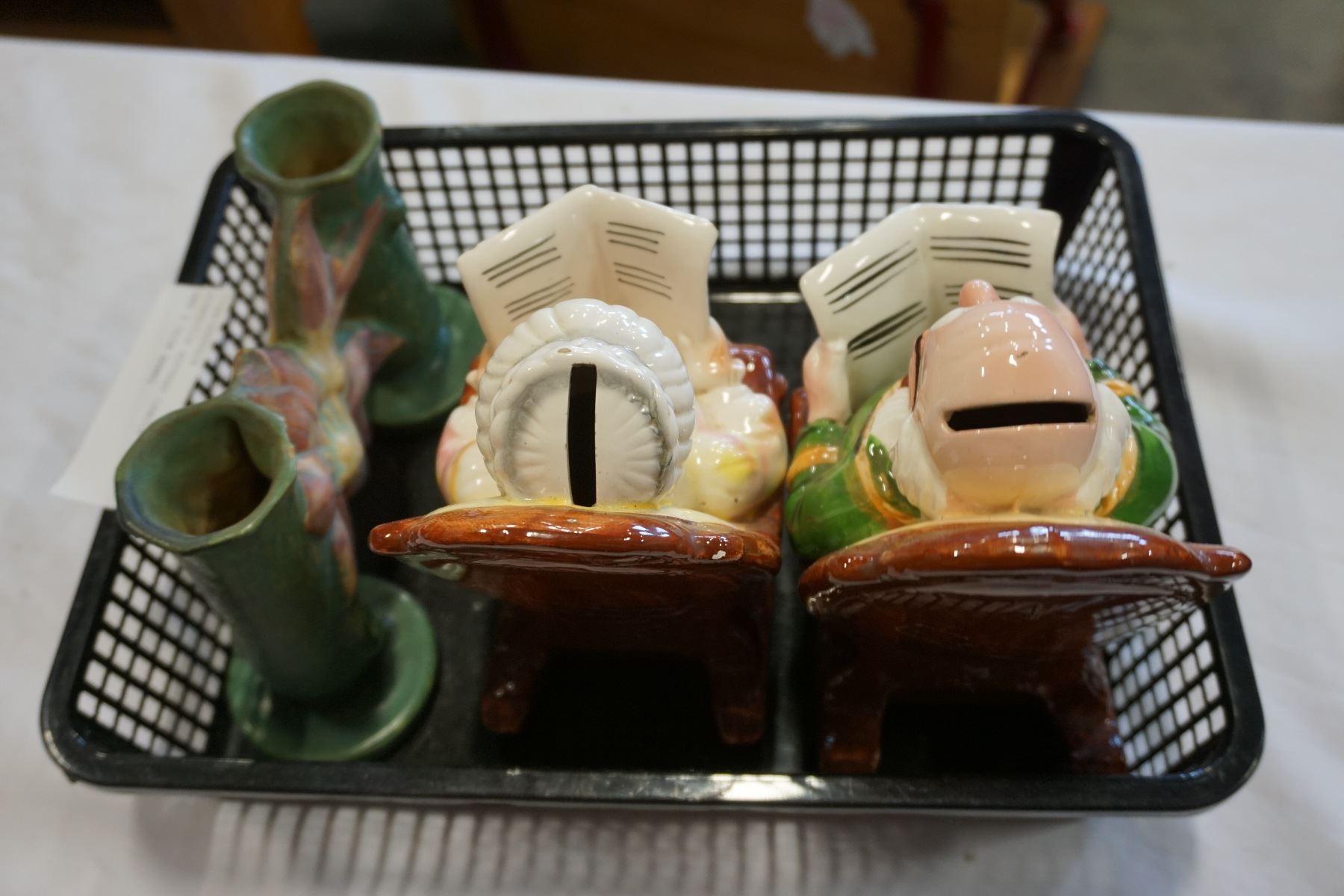 ROSEVILLE POTTERY CANDLE STAND AND 2 COIN BANKS