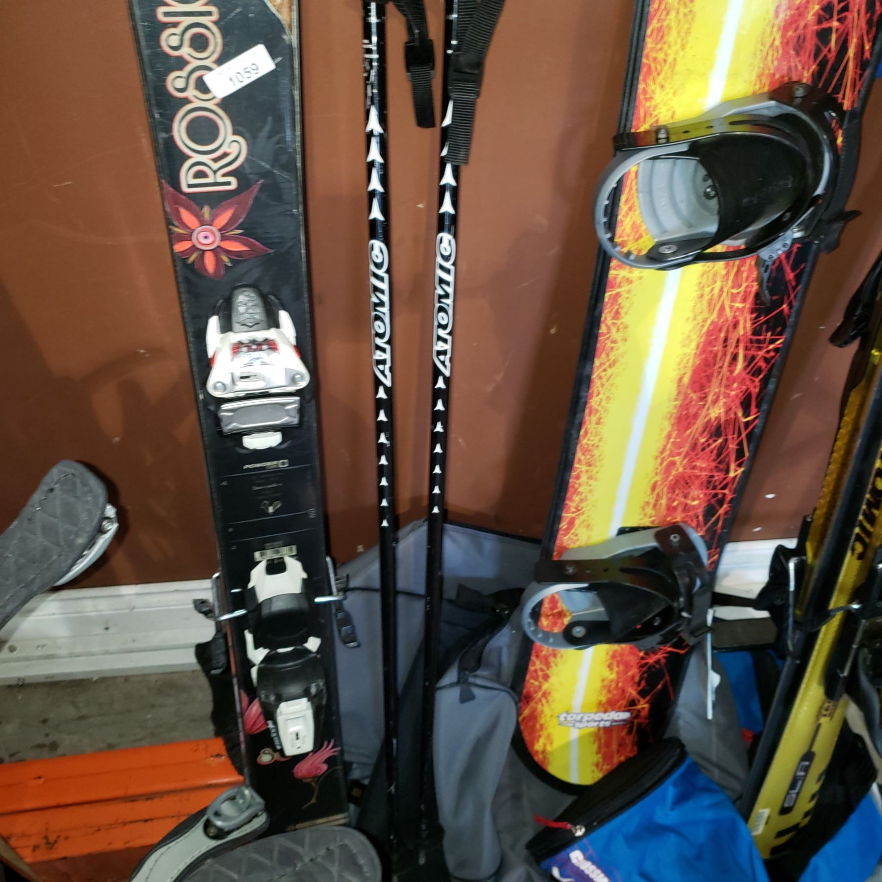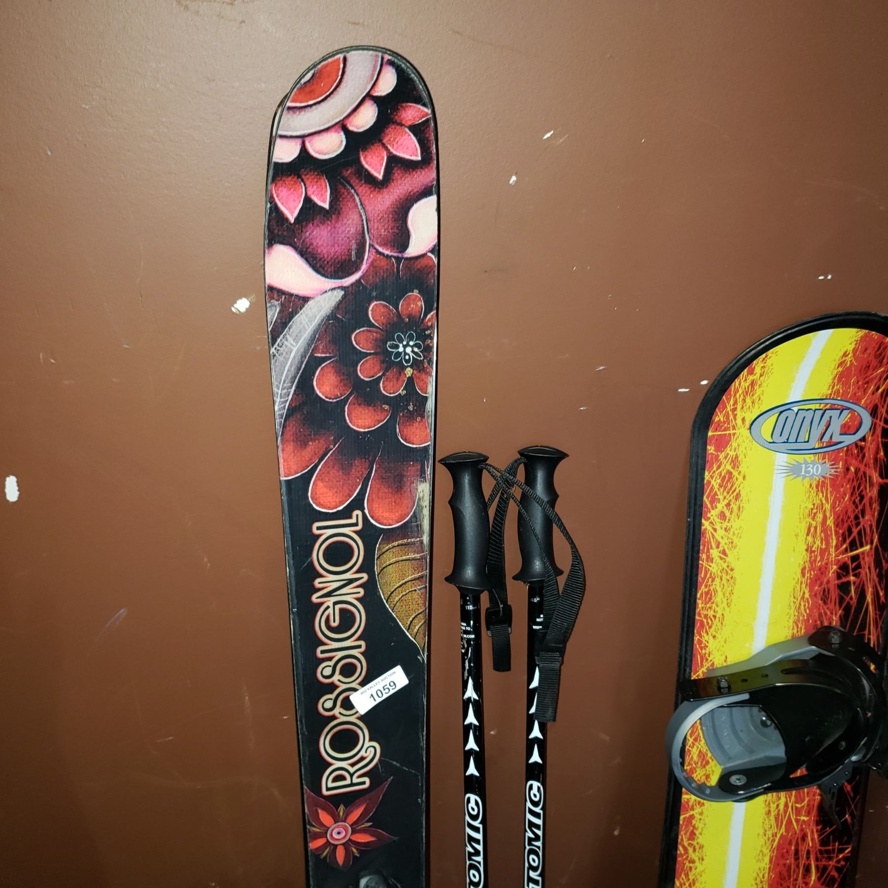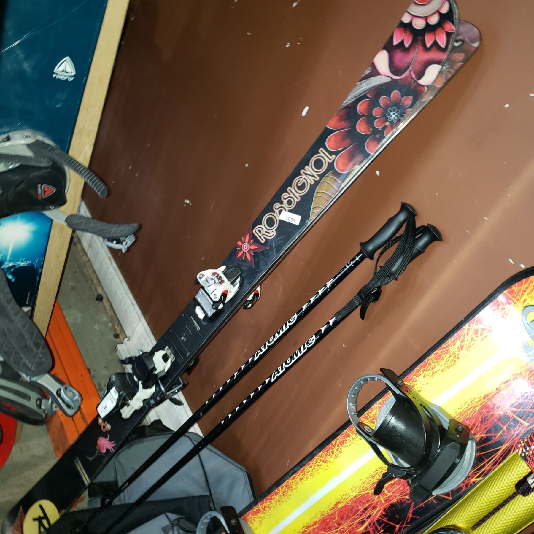 ROSSIGNOL POWDER TURN 159CM SKIS WITH MARKER X SQUIRE BINDINGS AND ATOMIC POLES