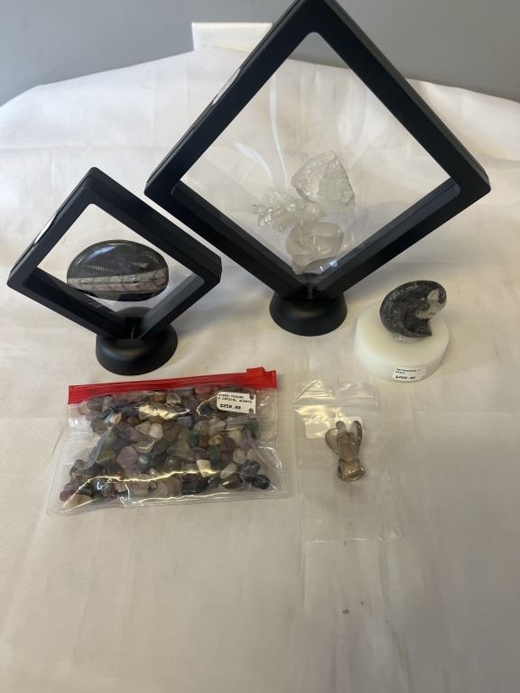 ROUGH CLEAR QUARTZ DISPLAY WITH FOSSILS, MIXED TUMBLED STONES AND SMOKEY QUARTZ ANGEL PENDANT