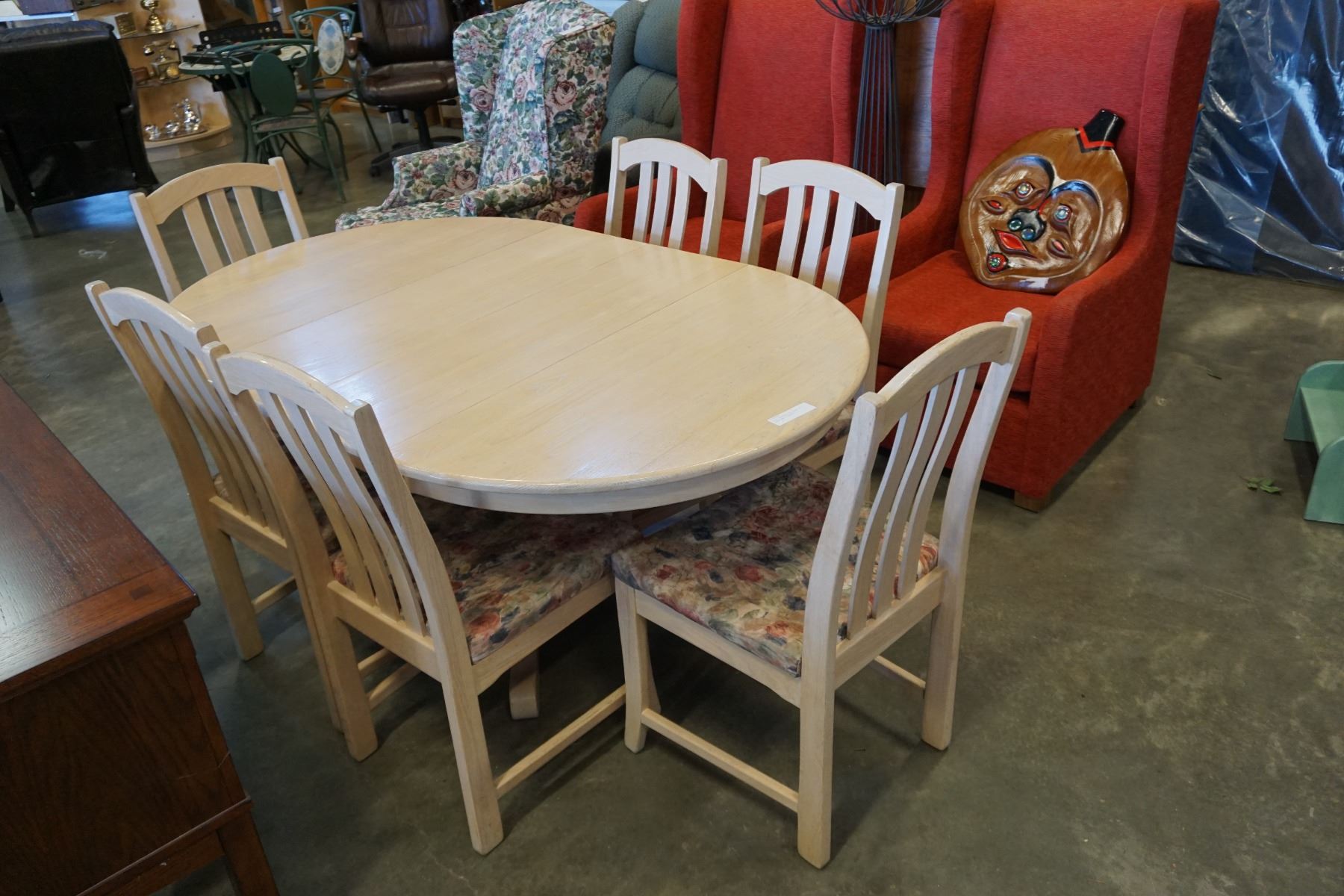 ROUND BLEACHED OAK TABLE W/ 2 LEAFS AND 6 CHAIRS