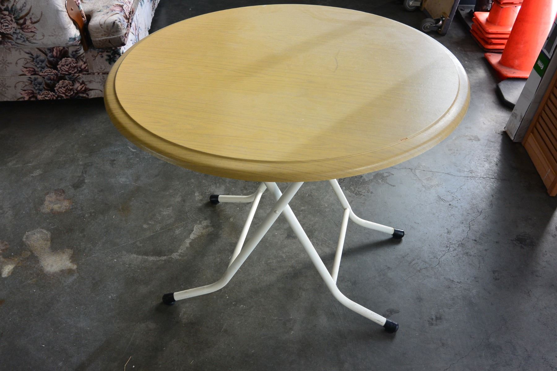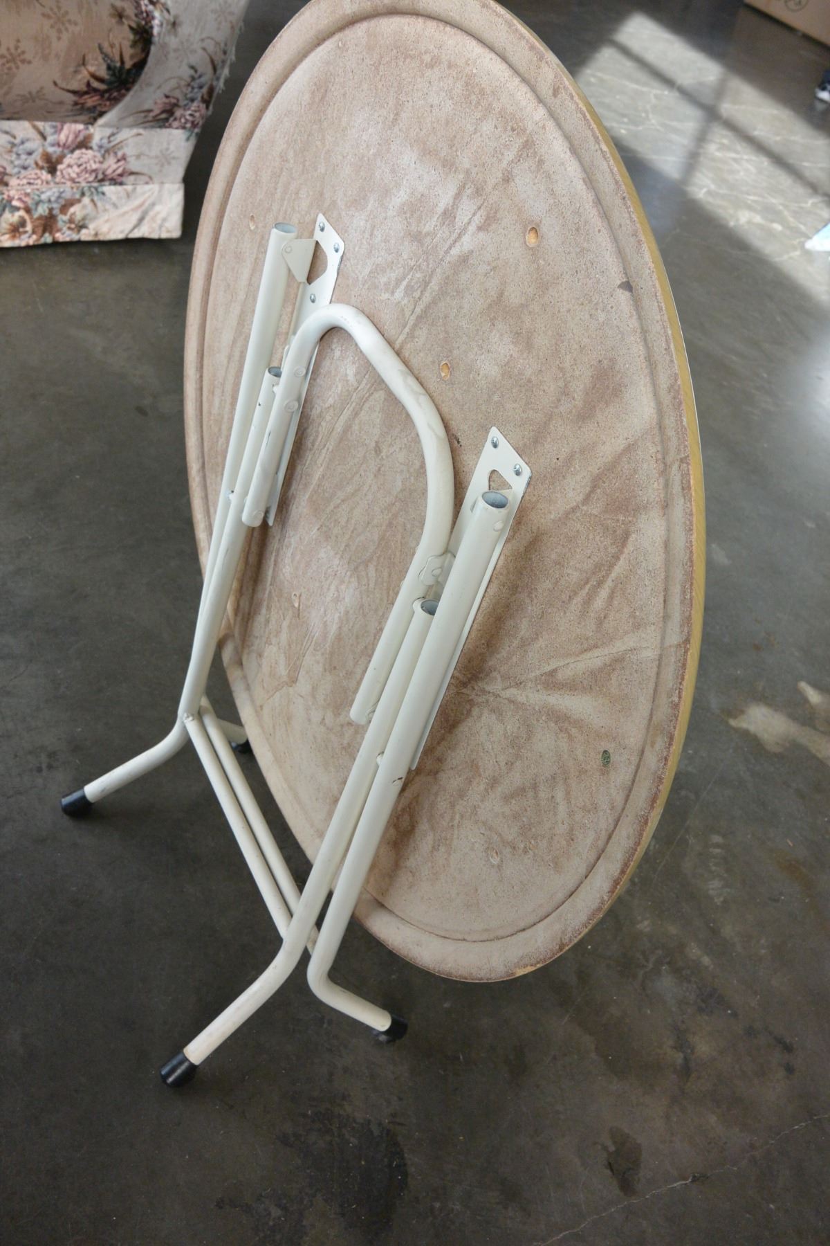 ROUND FOLDING TABLE AND 2 BARSTOOLS