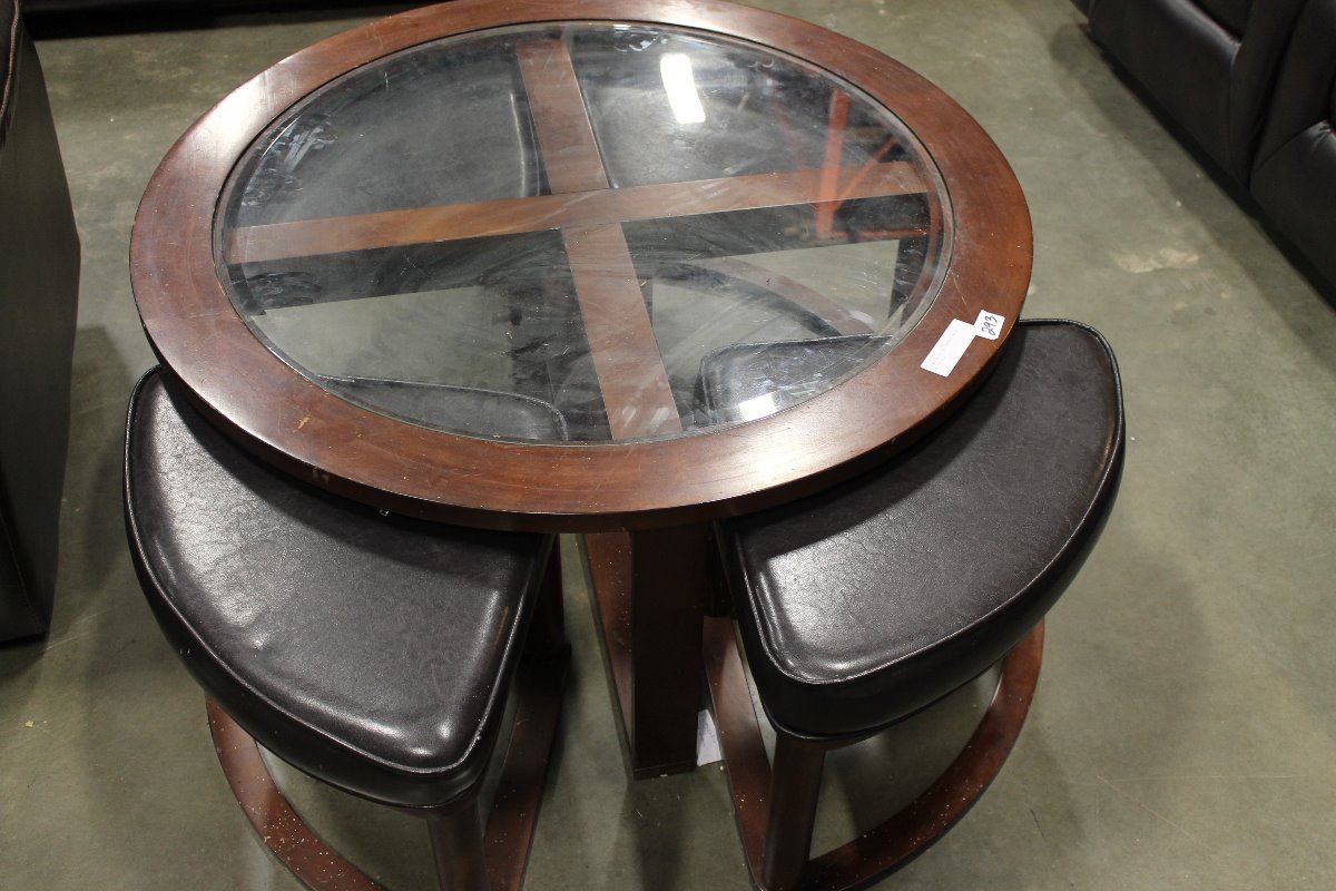 ROUND GLASS TOP COFFEE TABLE AND STOOLS
