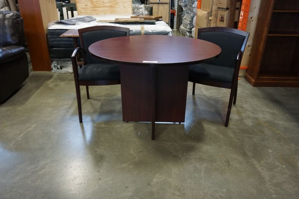 ROUND MAHOGANY FINISH TABLE WITH 2 CHAIRS