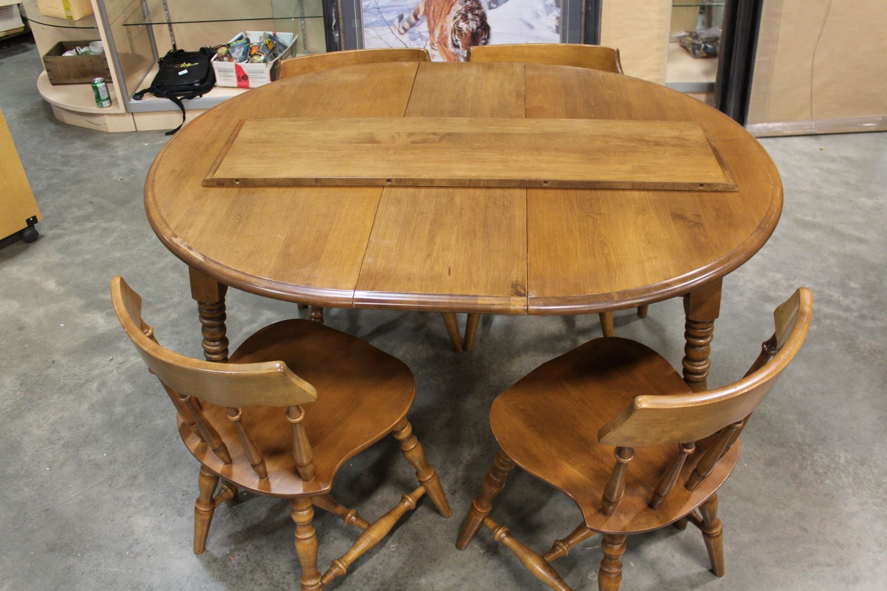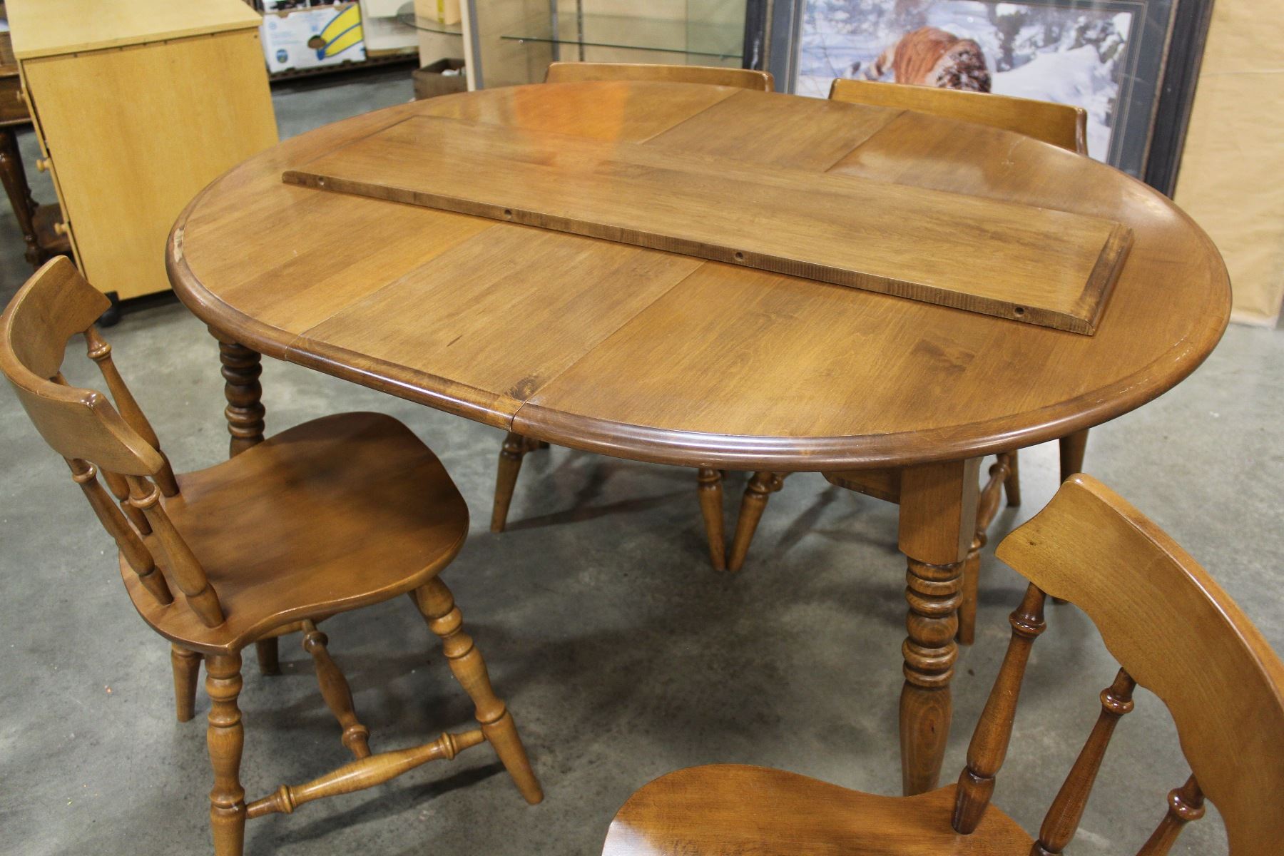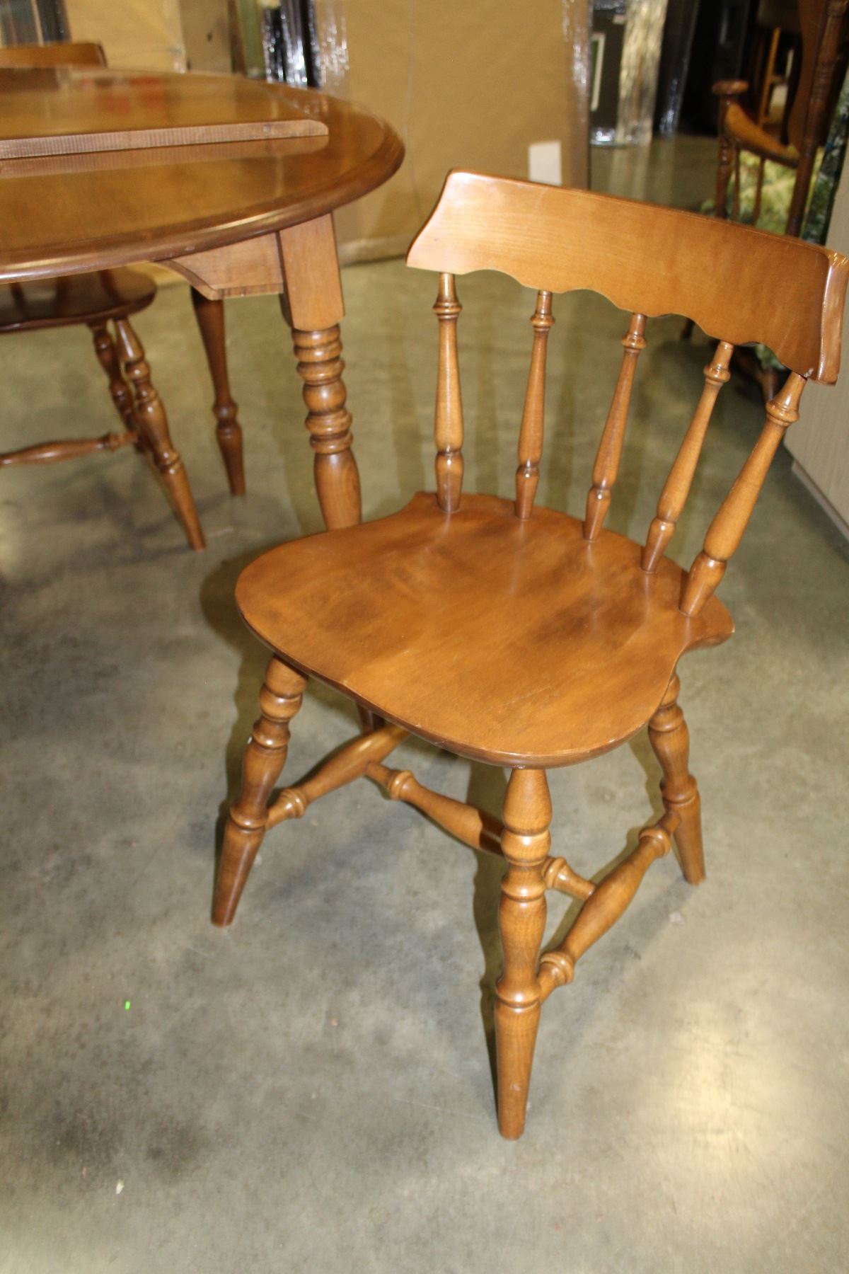 ROUND MAPLE DINING TABLE WITH 2 LEAFS AND FOUR CHAIRS