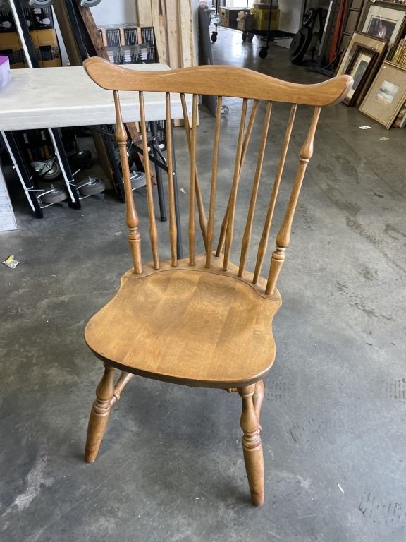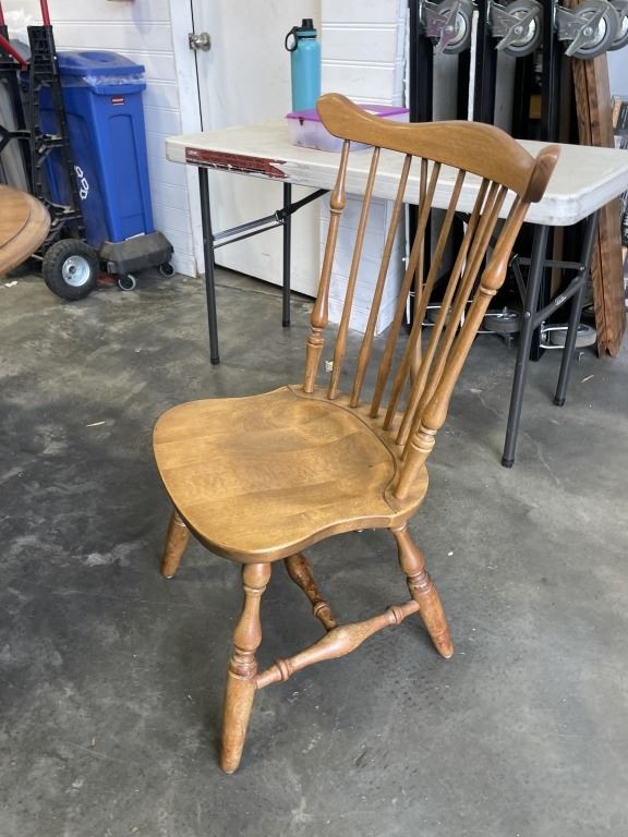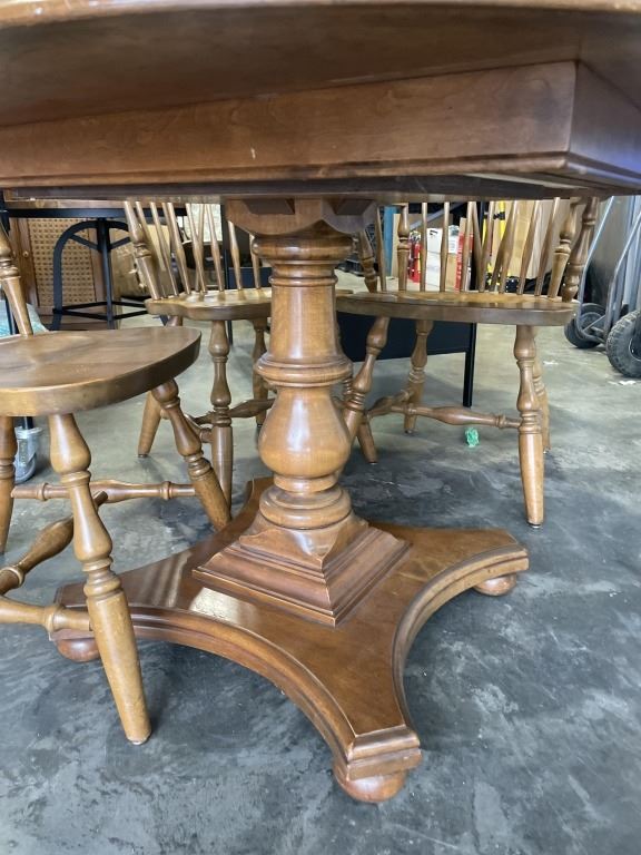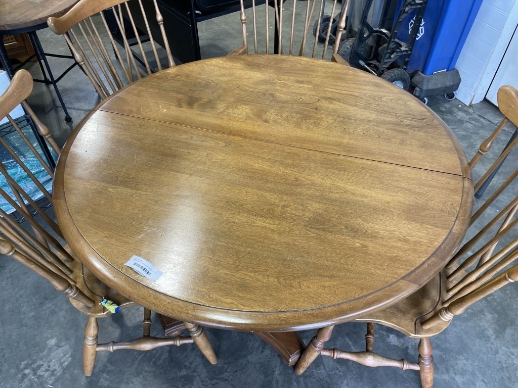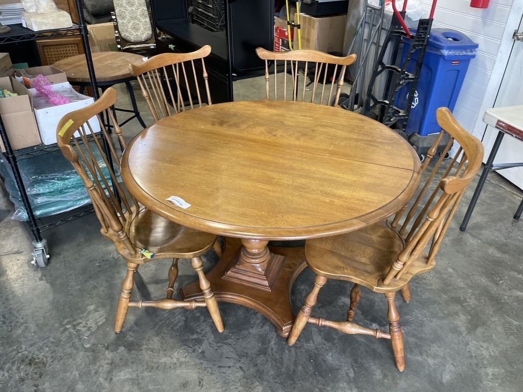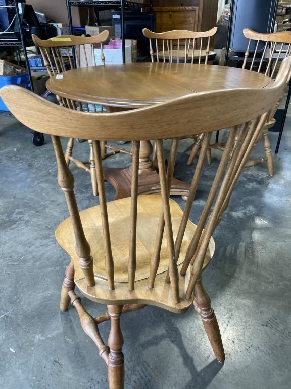 ROUND MAPLE TABLE AND 4 SPINDLE BACK CHAIRS