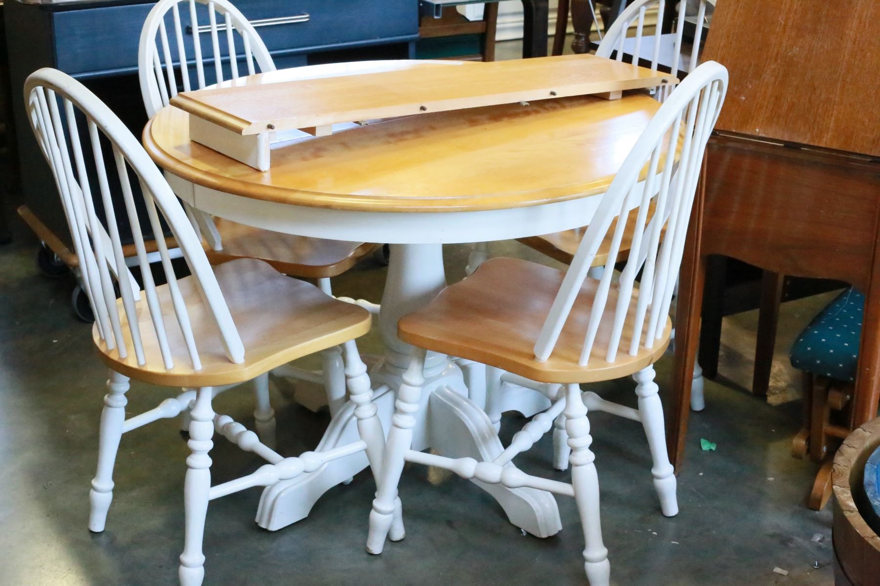 ROUND MAPLE TABLE WITH LEAF AND FOUR CHAIRS