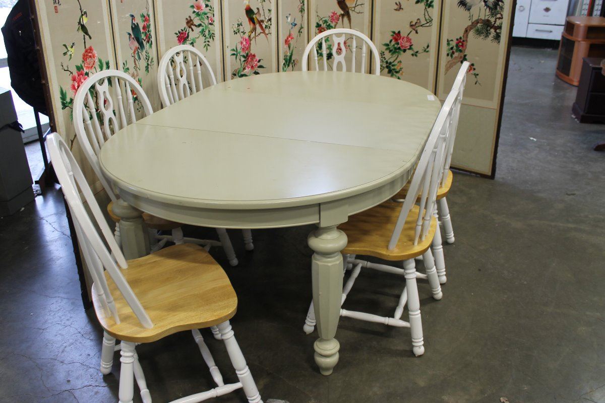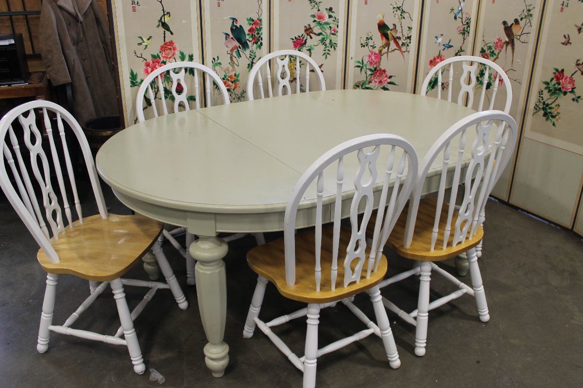 ROUND MODERN DINING TABLE WITH LEAF AND SIX ARROWBACK CHAIRS