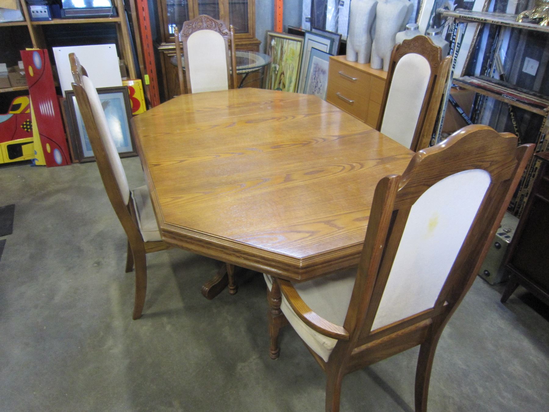 ROUND OAK DINING TABLE W/ 4 CHAIRS AND LEAF