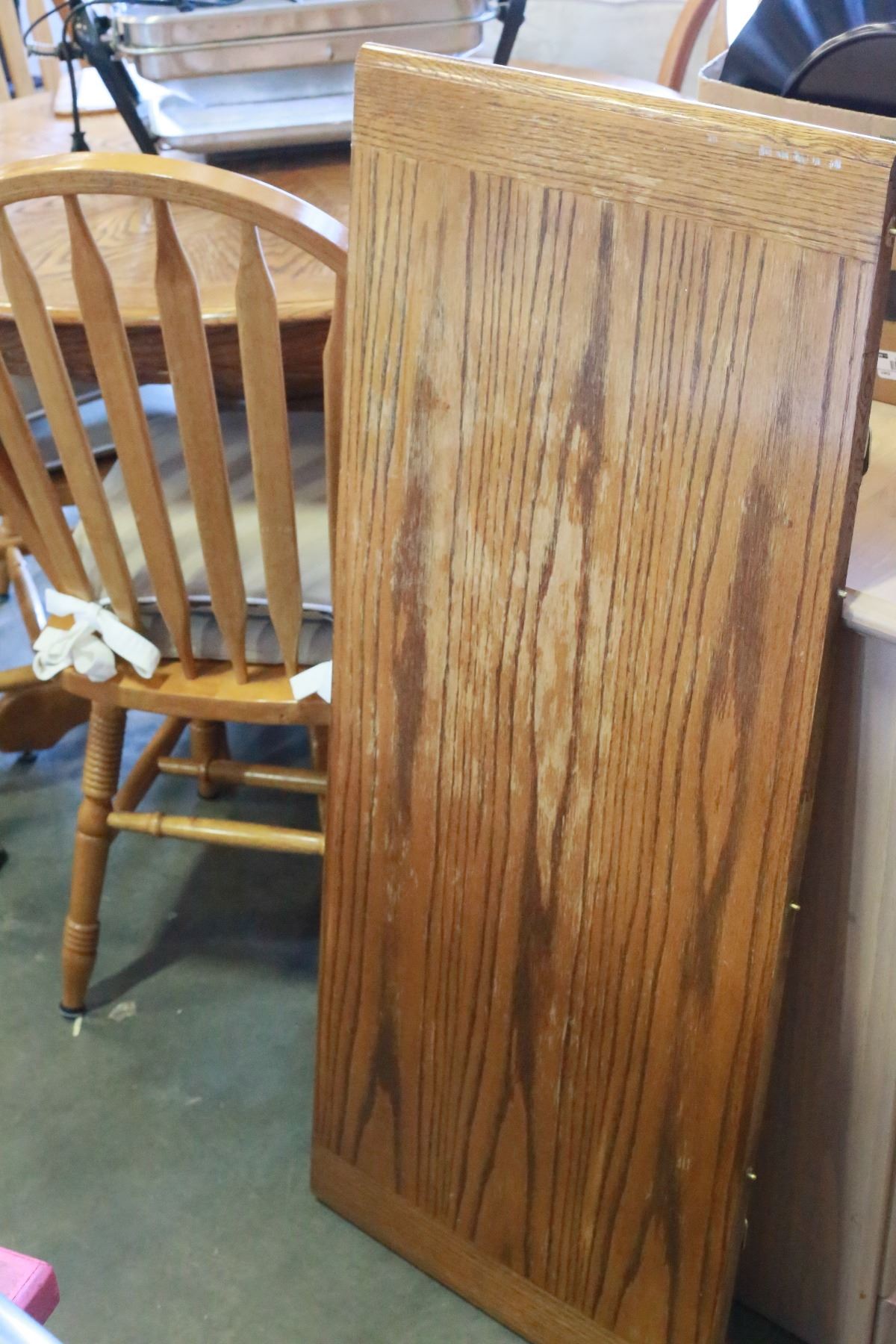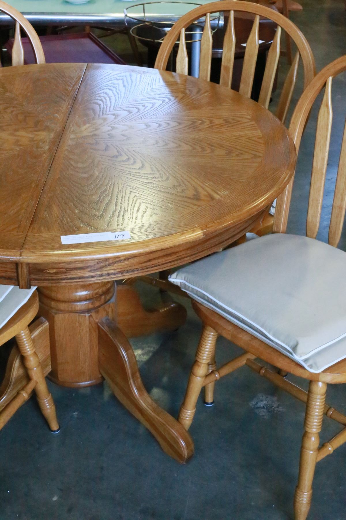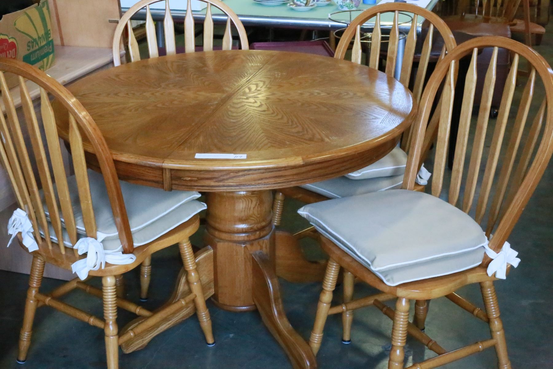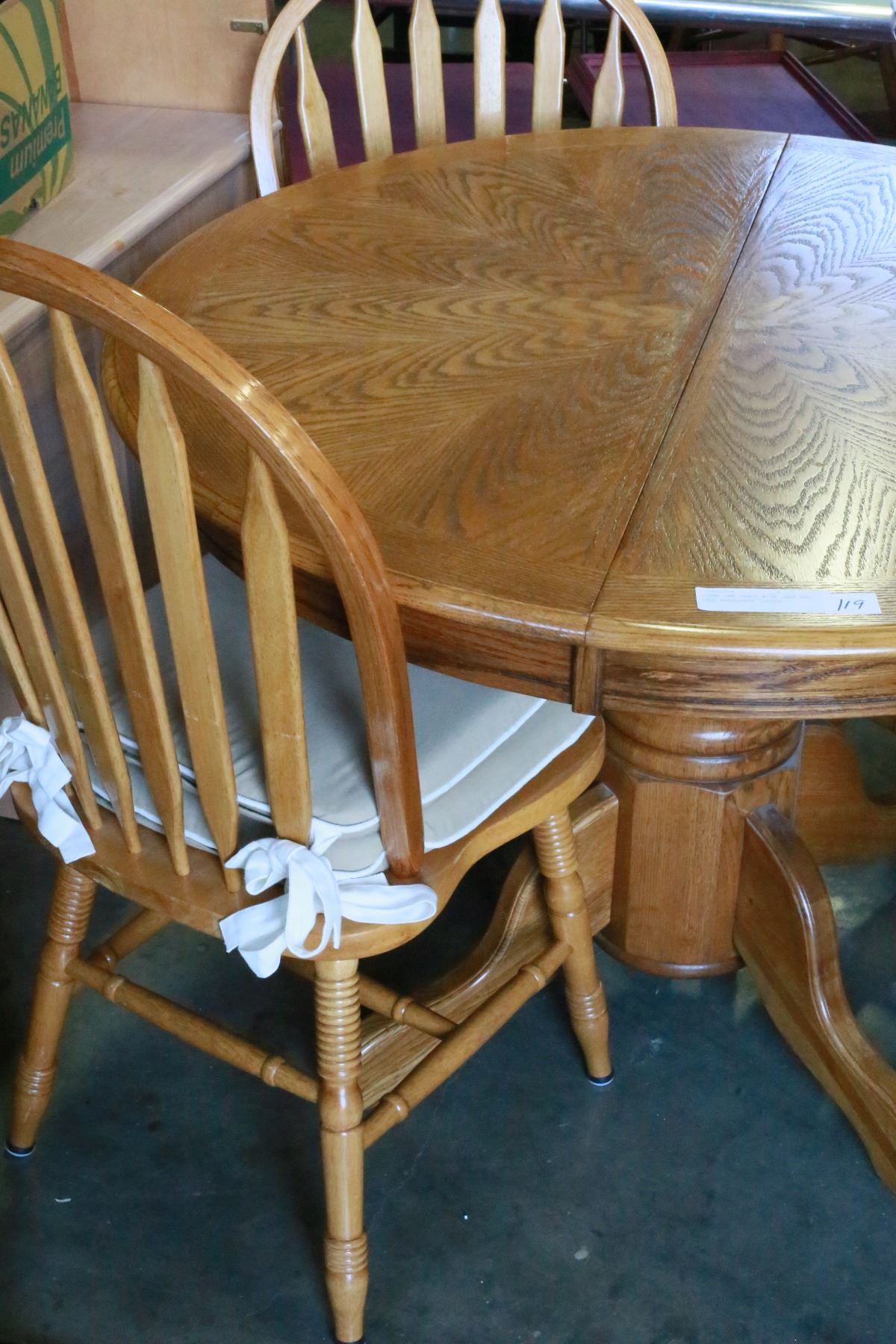ROUND OAK TABLE WITH LEAF AND FOUR PRESSBACK CHAIRS
