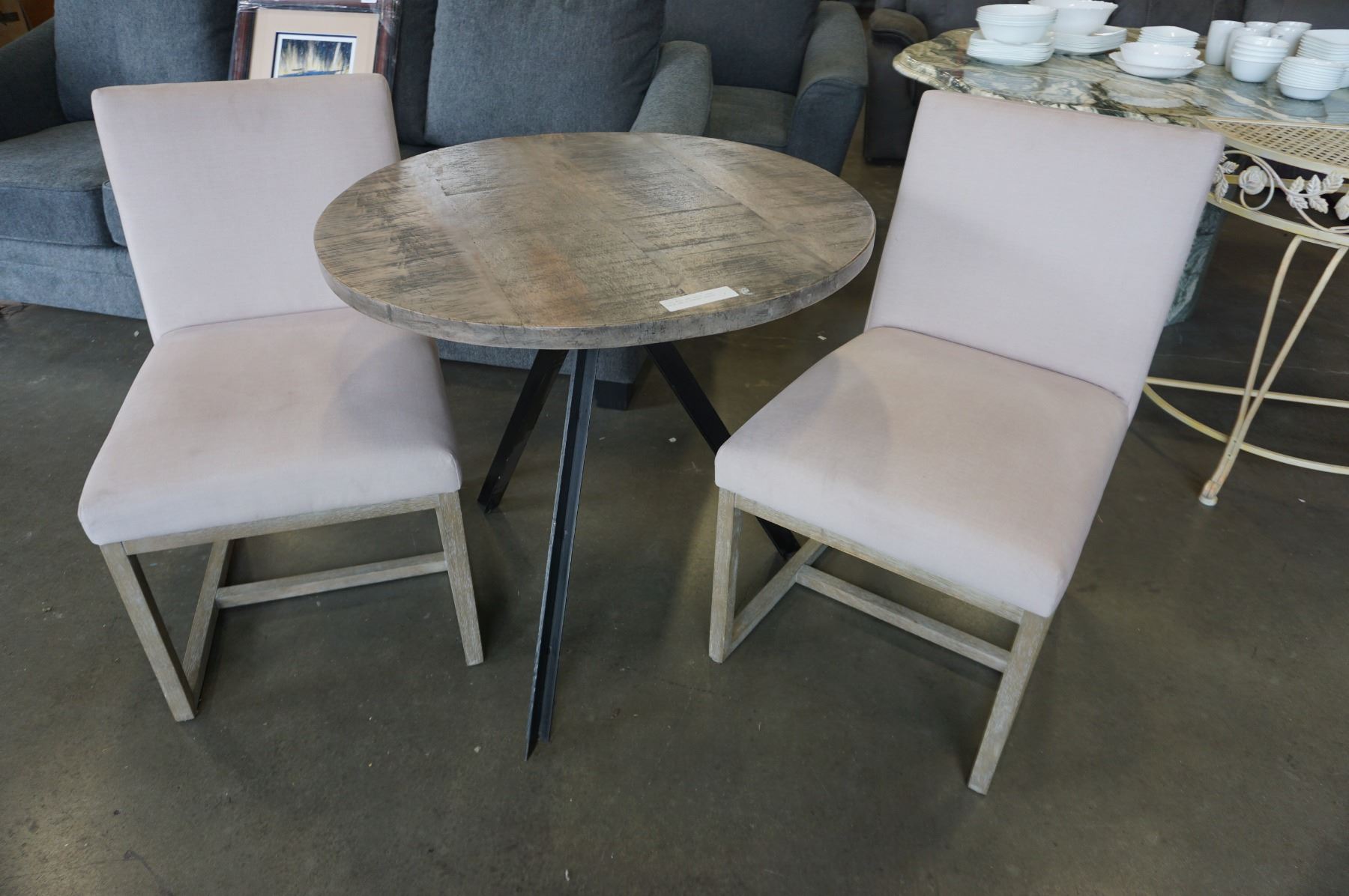 ROUND WOOD AND METAL BASE TABLE AND 2 DINING CHAIRS