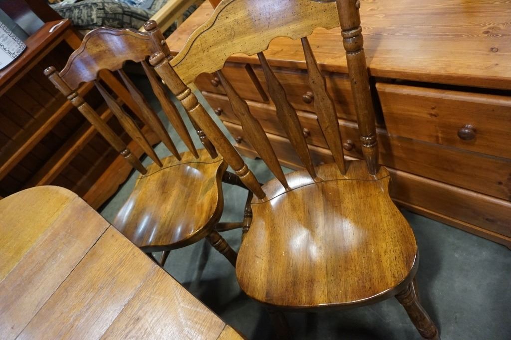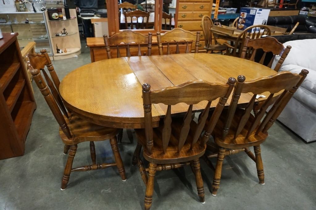 ROUND WOOD DINING TABLE WITH 3 LEAFS AND 6 CHAIRS