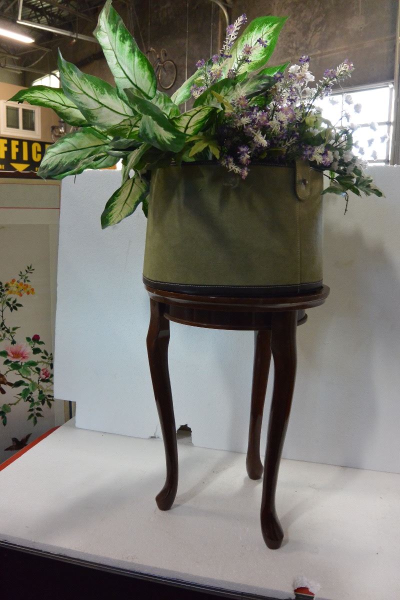 ROUND WOOD PLANTSTAND & LEATHER PLANTER W/ FLORAL