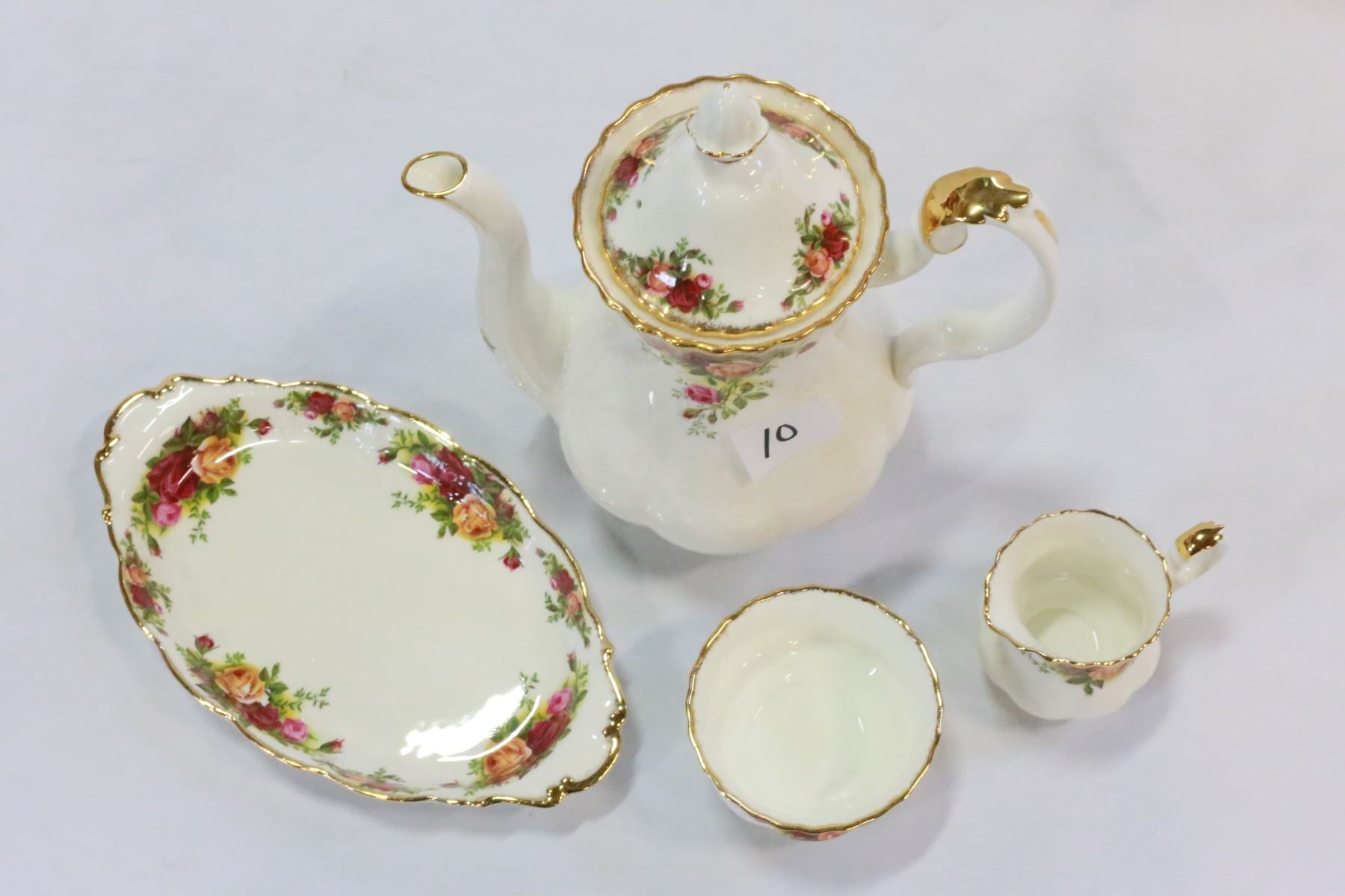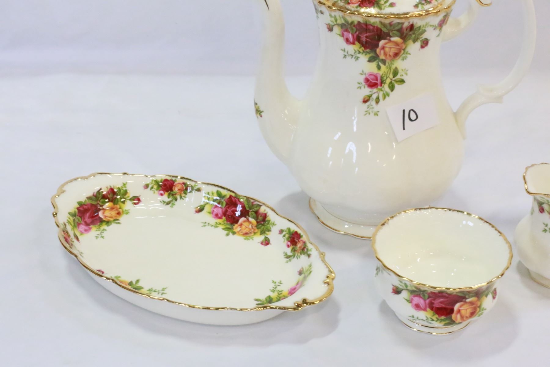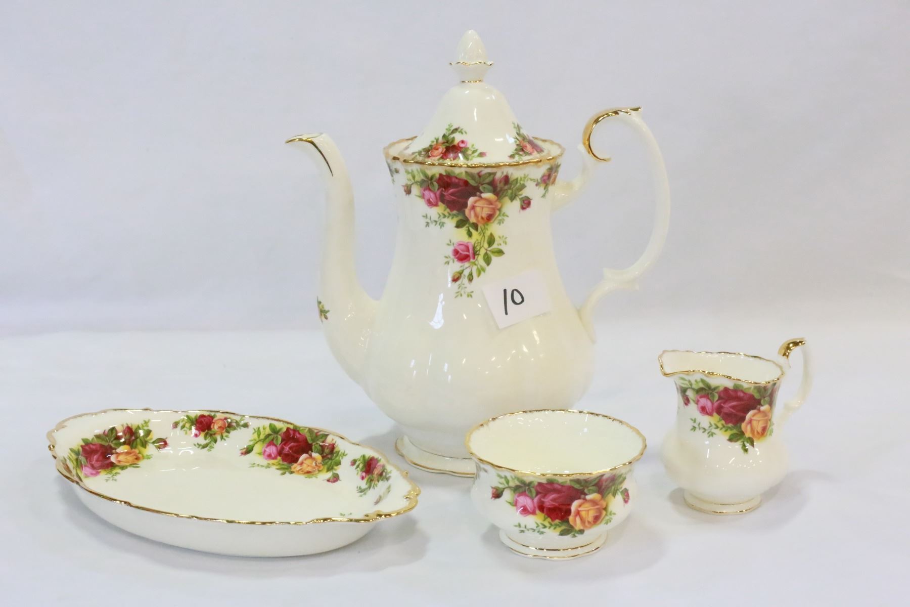 ROYAL ALBERT OLD COUNTRY ROSES COFFEE POT AND CREAM AND SUGAR ON TRAY