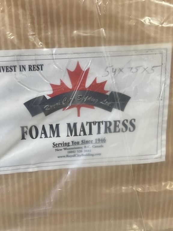 ROYAL CITY BEDDING FOAM MATTRESS. 54" X 74" X 5" THICK