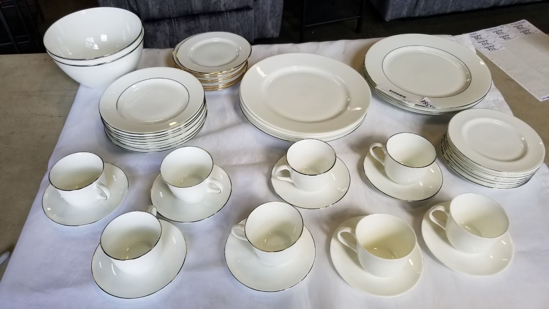 ROYAL DOULTON SIGNATURE PLATINUM 8 CUPS AND SAUCERS AND 8 PLACE SETTING PLATES, 8 ROYAL DOULTON SIMPLY GOLD PLATES AND 2 GLUCKSTEIN HOME CHINA BOWLS