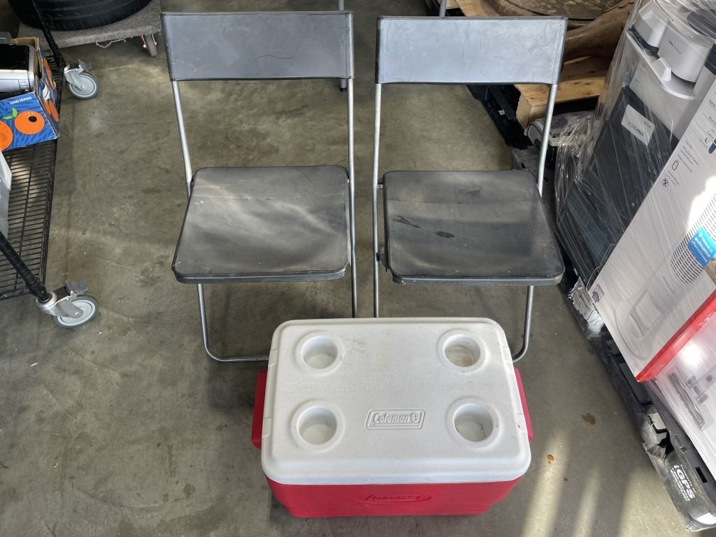 RUBBERMAID COOLER AND TWO FOLDING CHAIRS