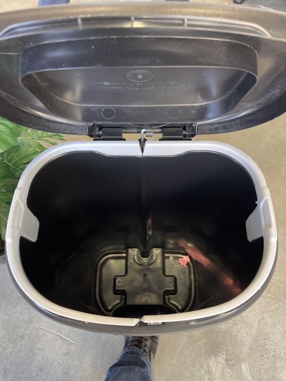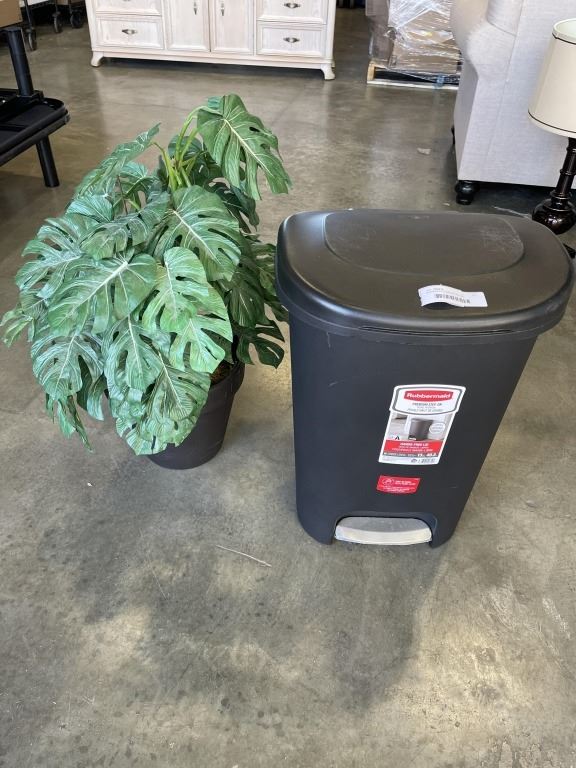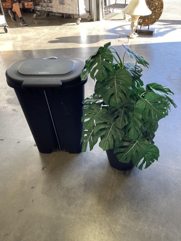 RUBBERMAID GARBAGE CAN AND ARTIFICIAL PLANT