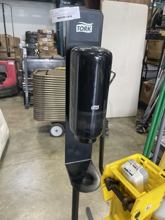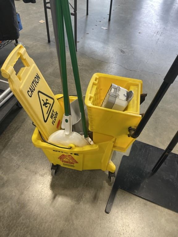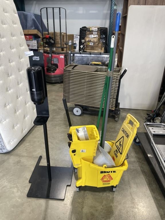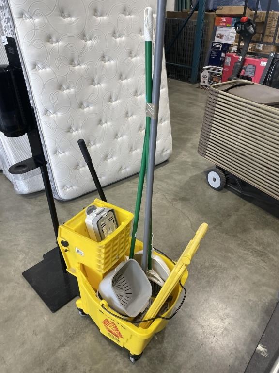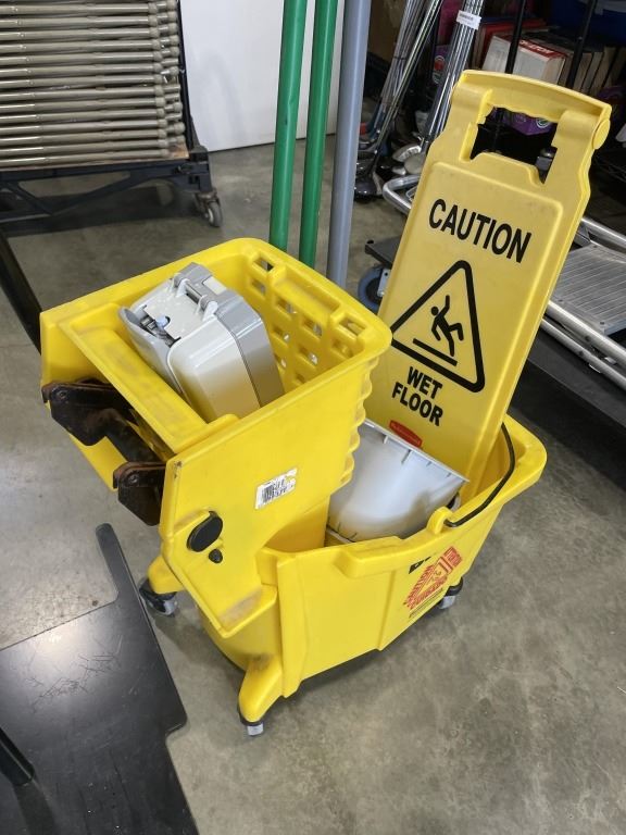 RUBBERMAID MOP BUCKET WITH WET FLOOR SIGN, MOTION SANITIZER DISPENSER WORKING, WRINGER AND MOP