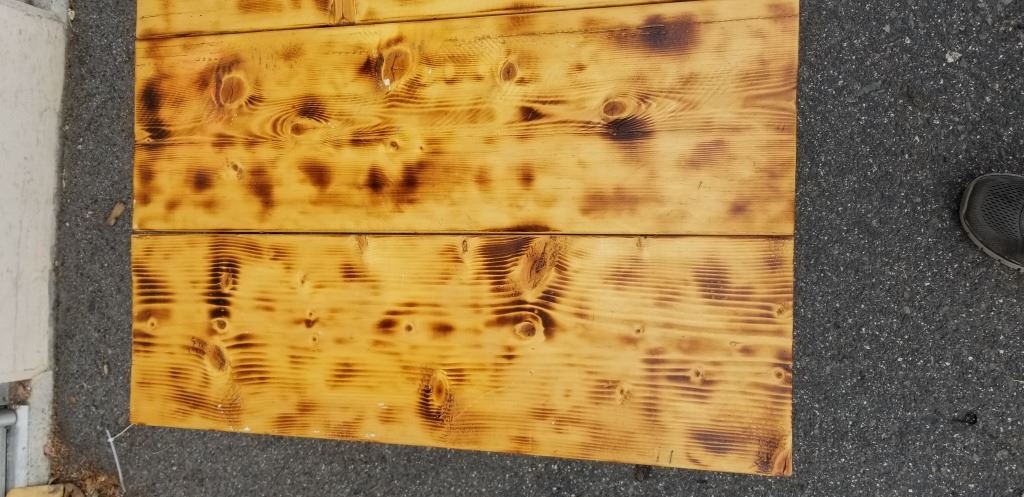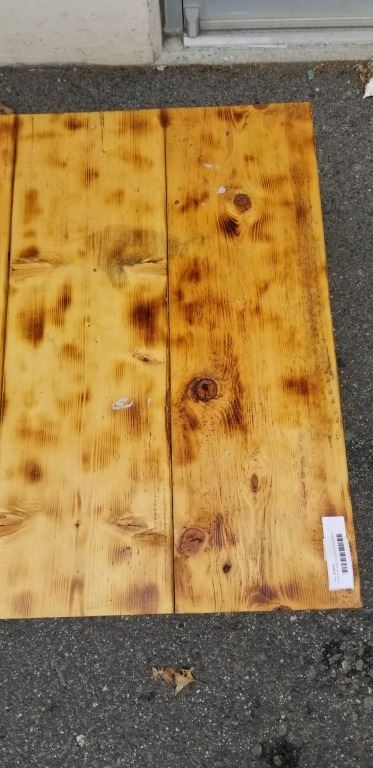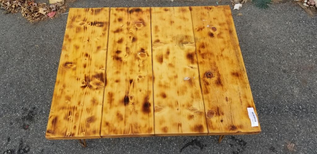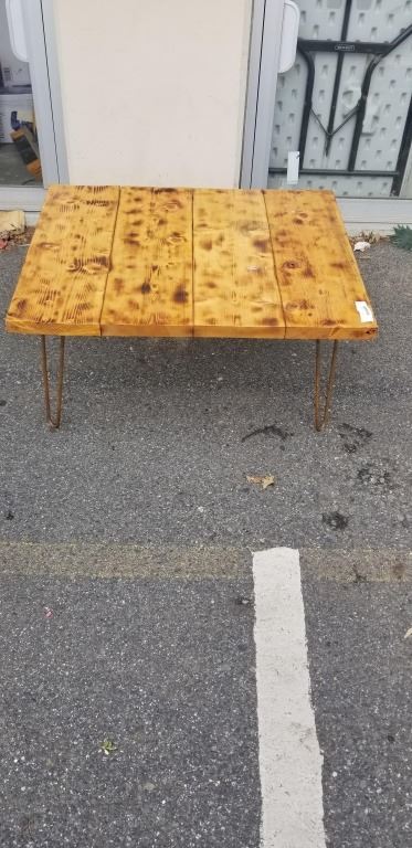 RUSTIC BURNED WOOD COFFEE TABLE WITH HAIR PIN LEGS