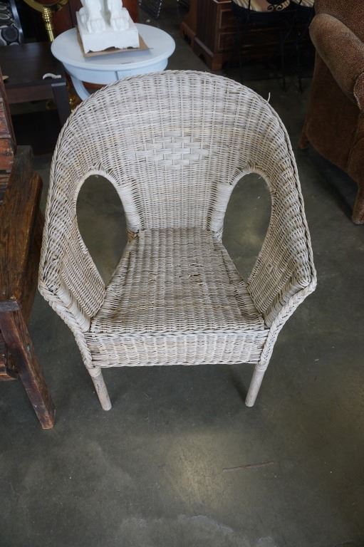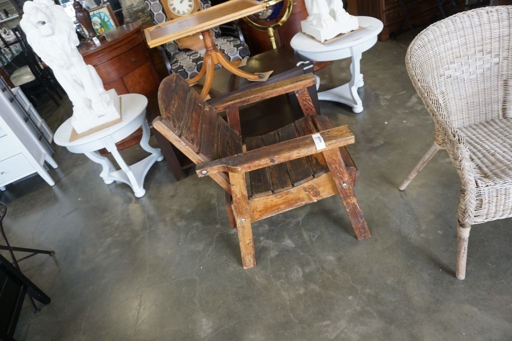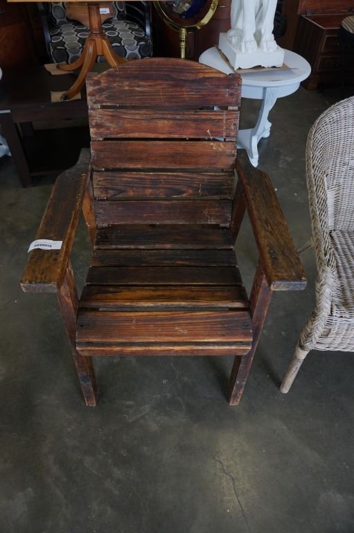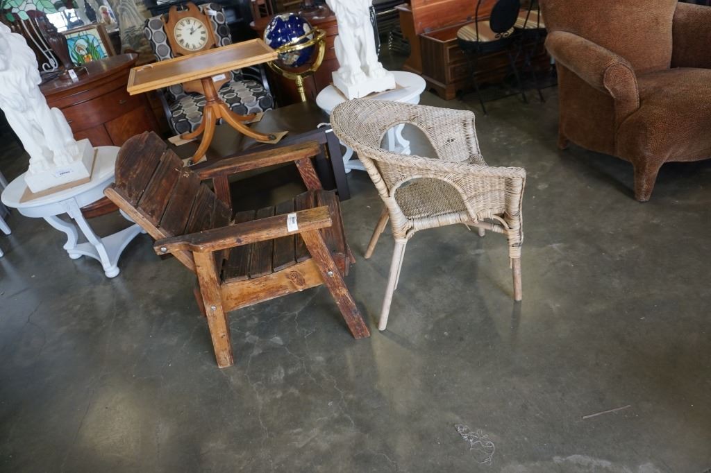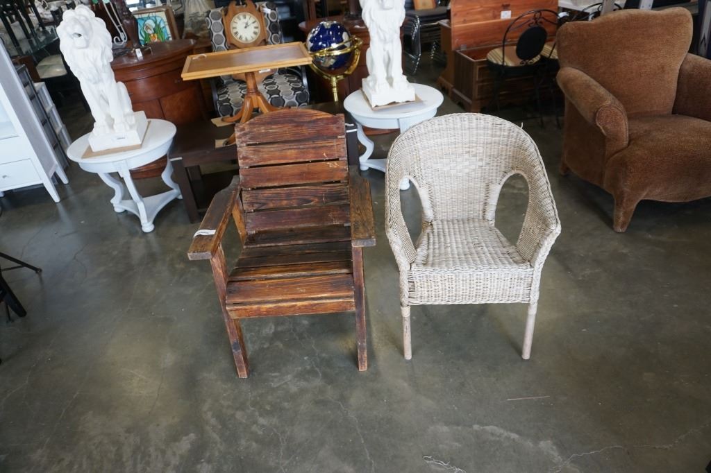RUSTIC WOOD PATIO CHAIR AND WICKER PATIO CHAIR