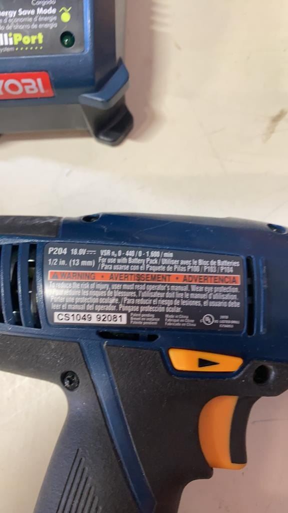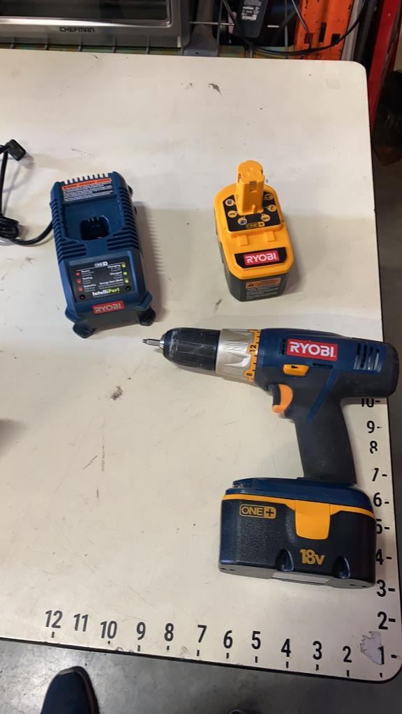RYOBI 18V CORDLESS DRILL WITH BATTERIES AND CHARGER