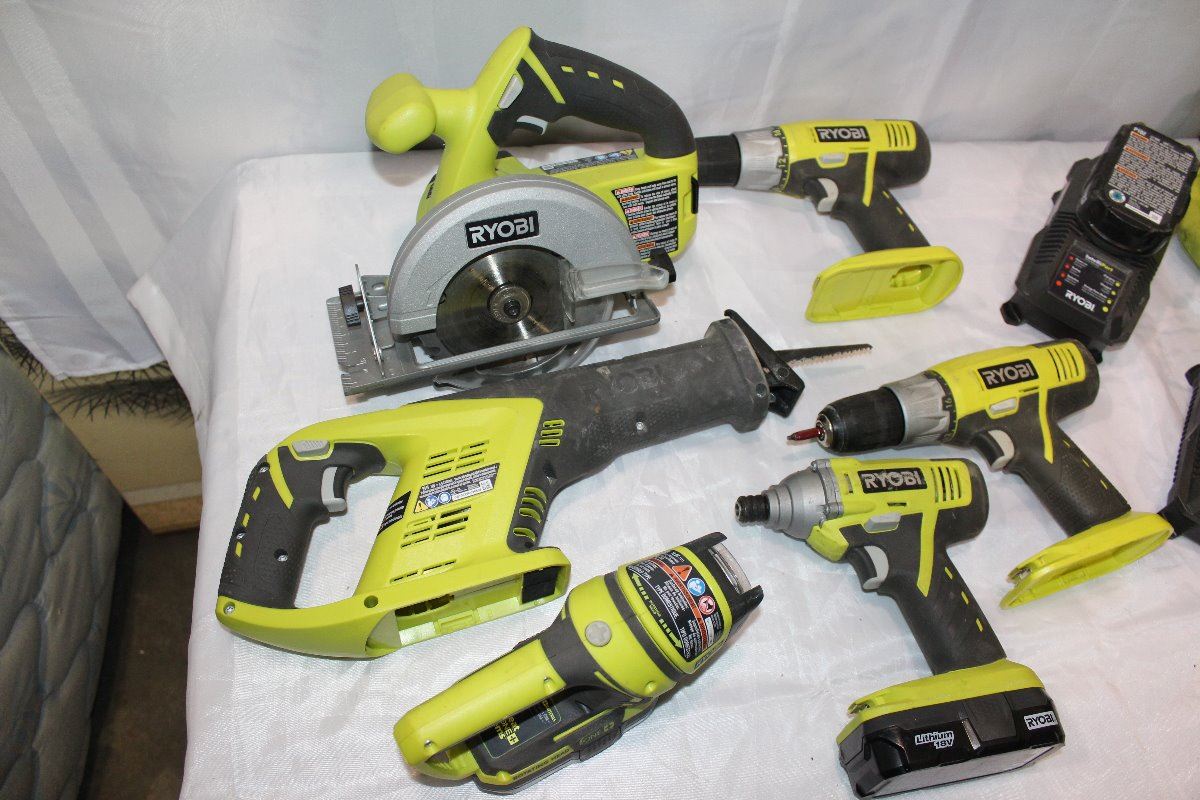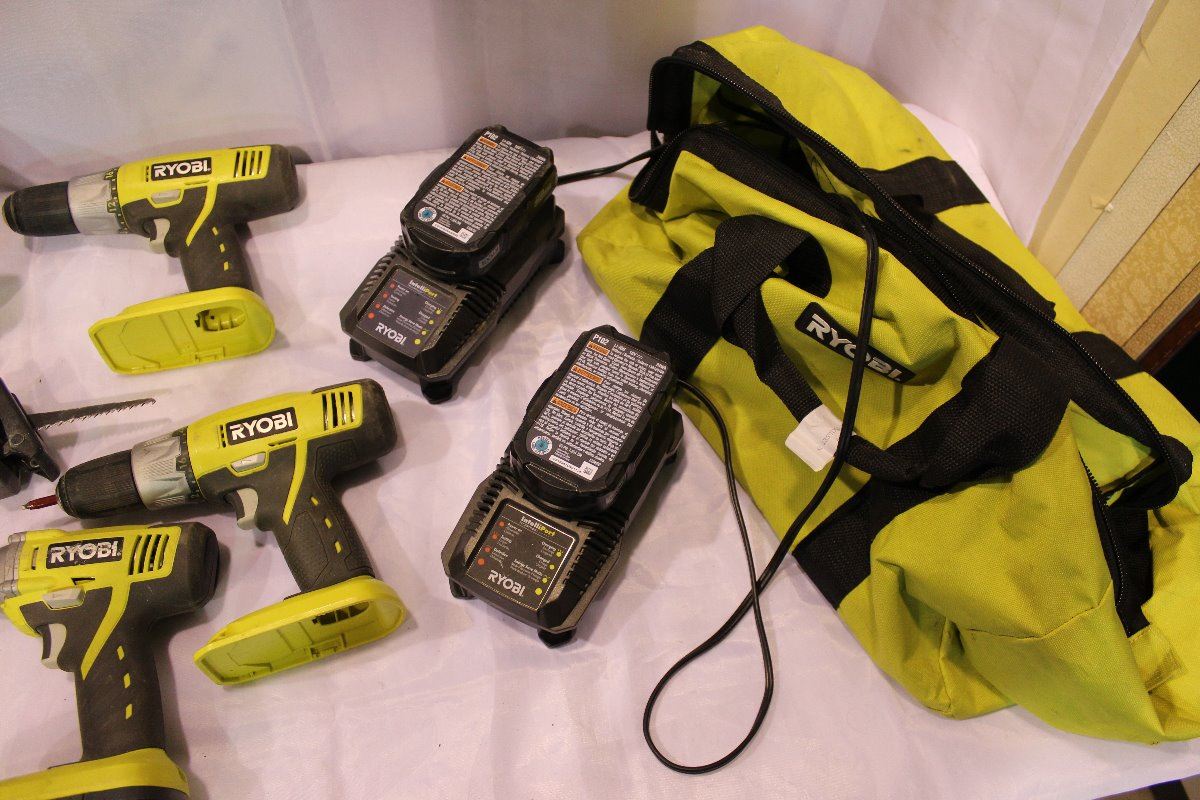 RYOBI 18V LITHIUM SIX PIECE CORDLESS TOOL SET WITH 4 BATTERIES, 2 CHARGERS, AND BAG