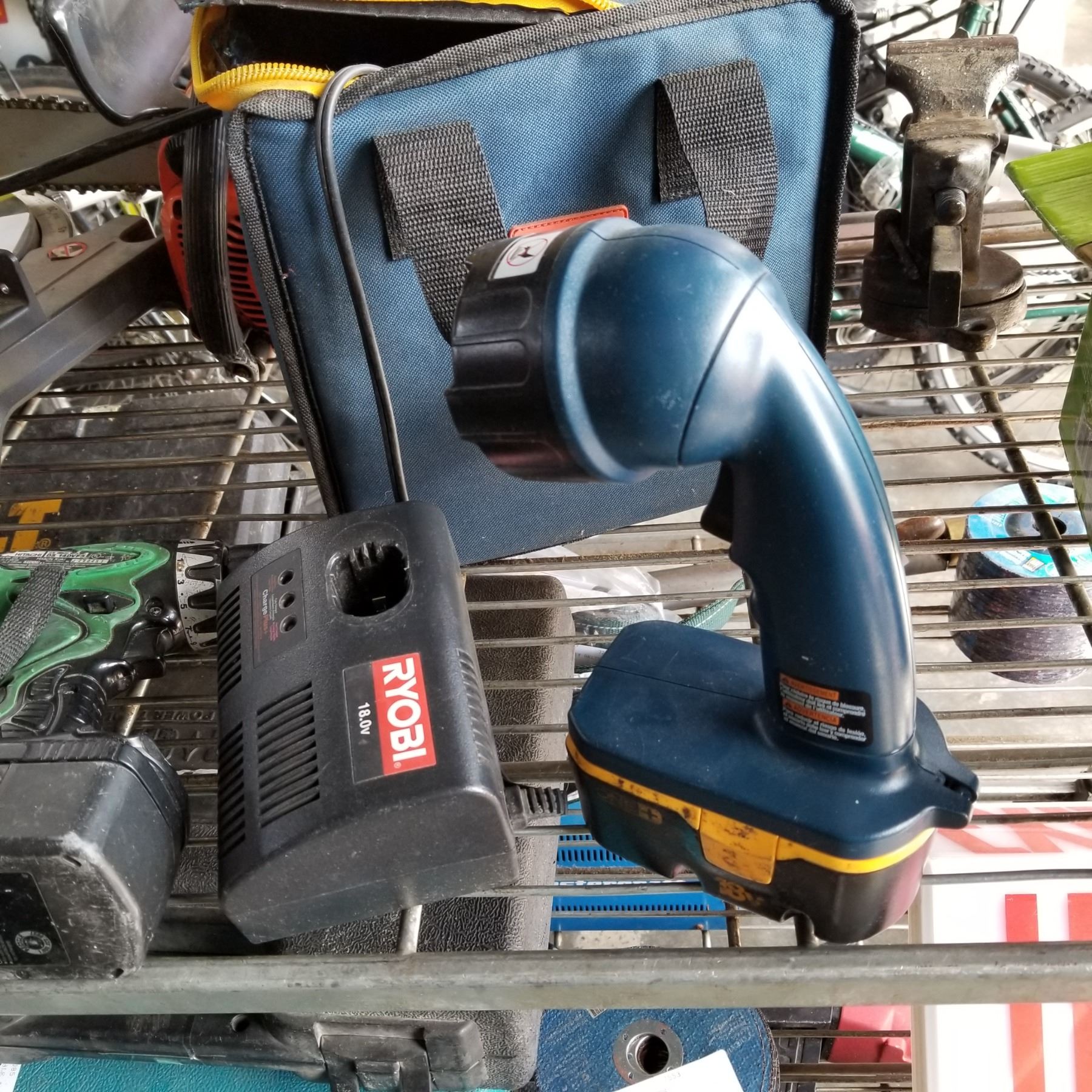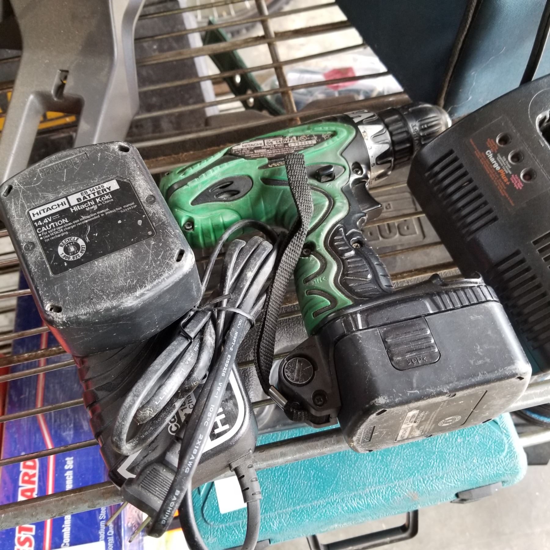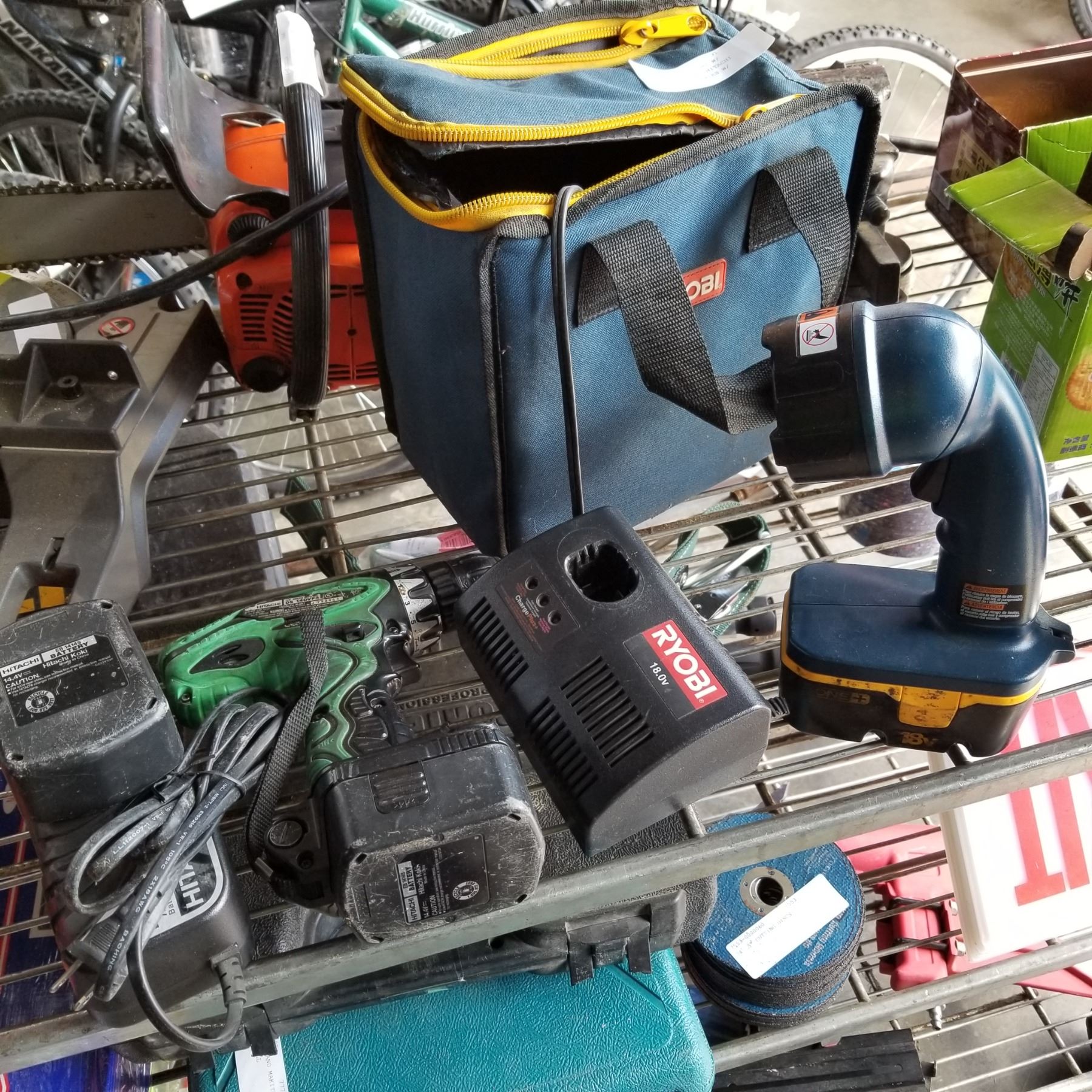 RYOBI CORDLESS LIGHT W/ CARRYING CASE AND HITACHI DRILL W/ 2 BATTERIES W/ CHARGER