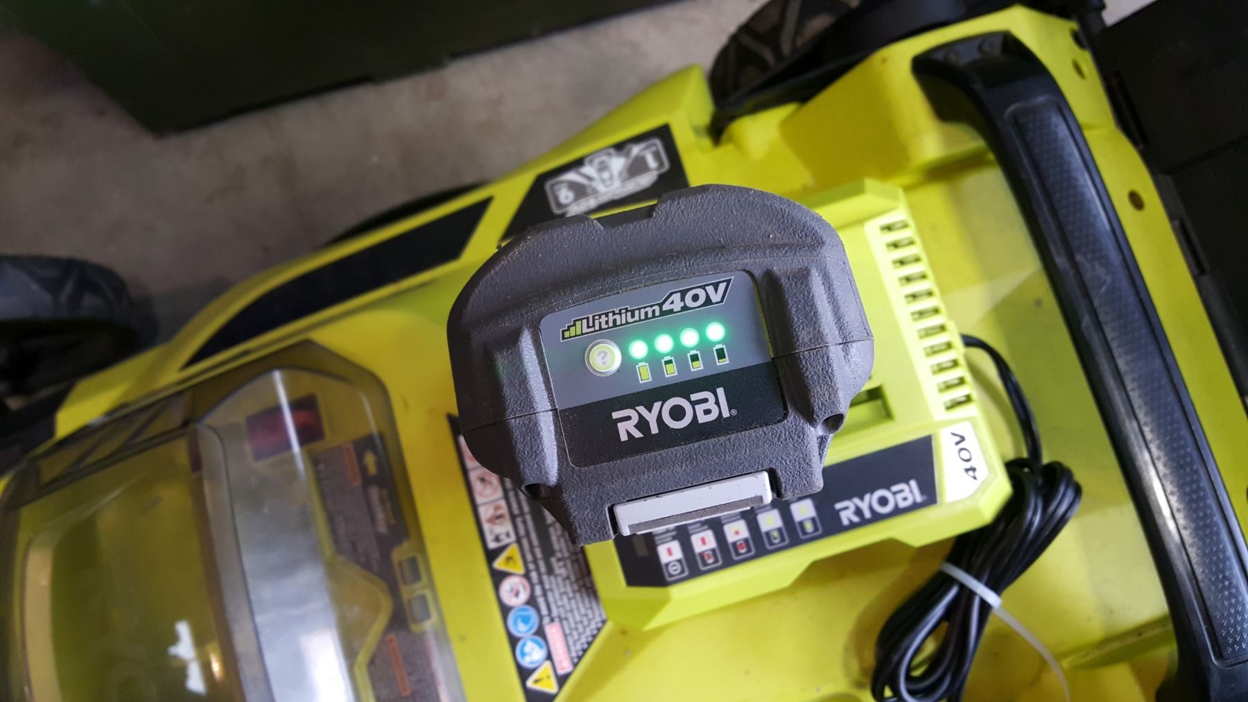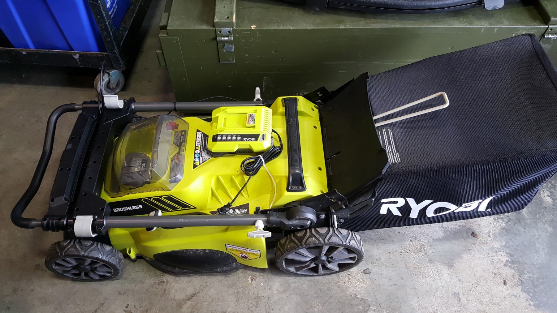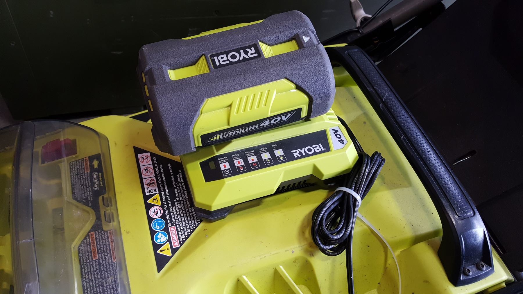 RYOBI ELECTRIC LAWNMOWER WITH BATTERY AND CHARGER, WORKING