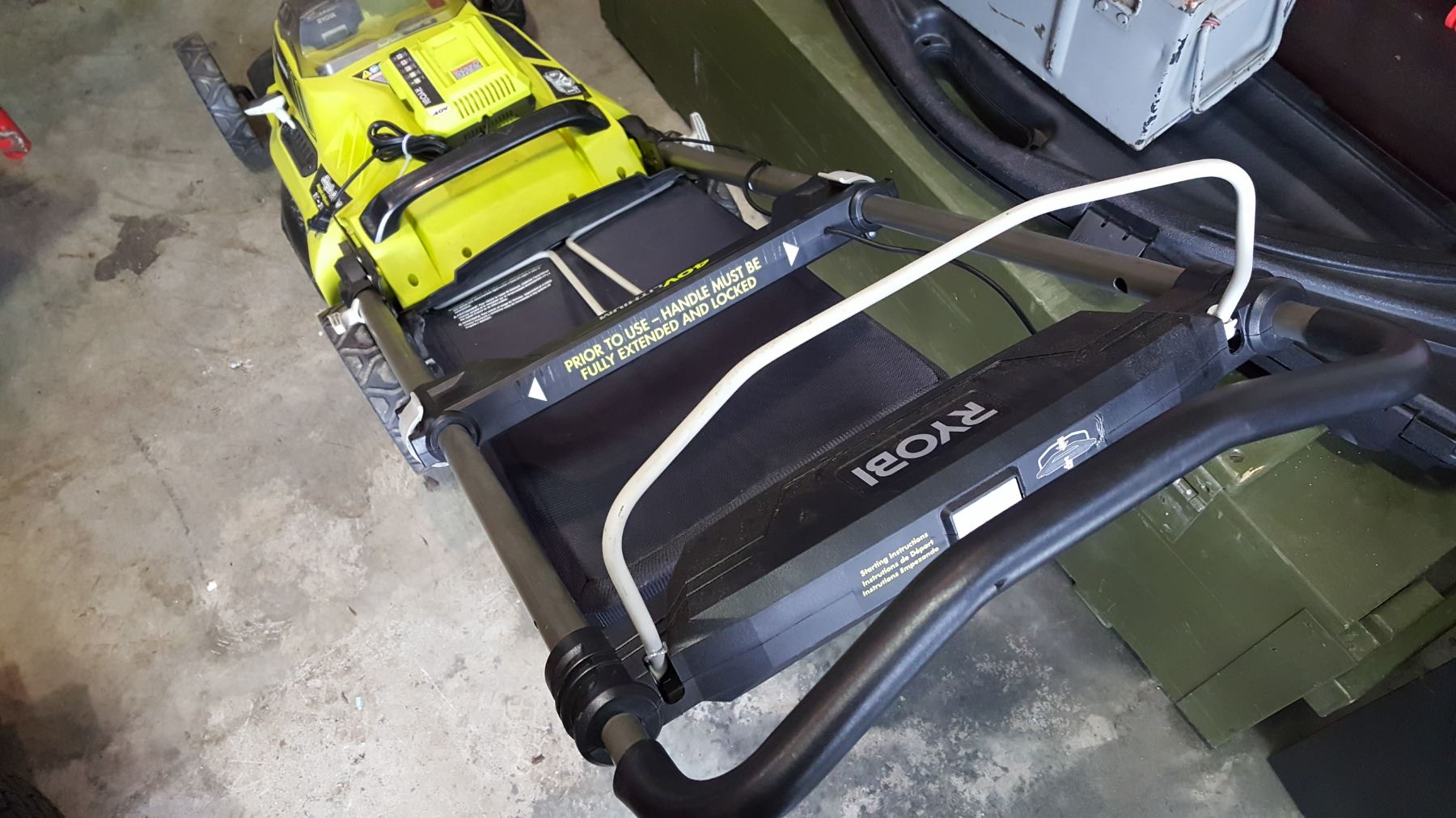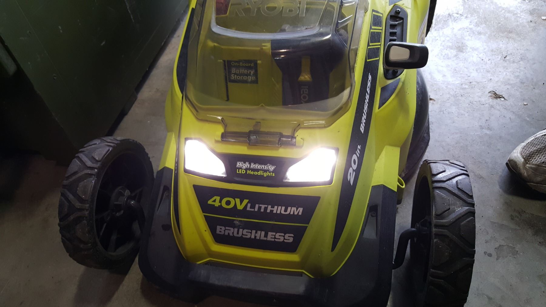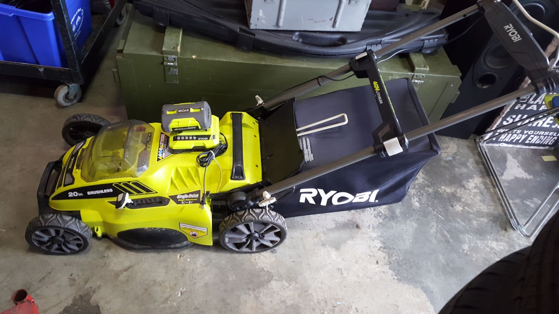 RYOBI ELECTRIC LAWNMOWER WITH BATTERY AND CHARGER, WORKING