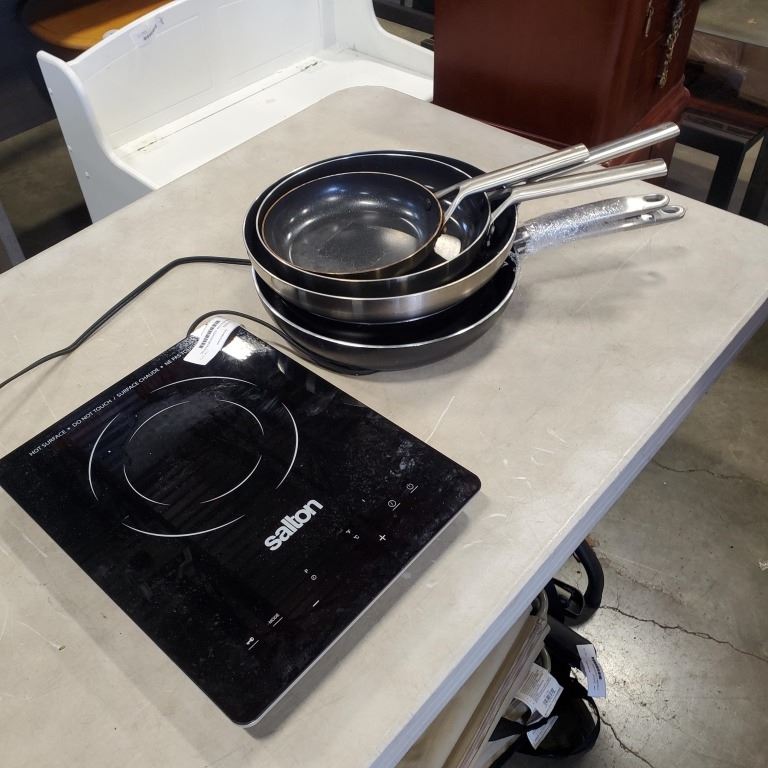 SALTON INDUCTION COOKTOP WITH BLUE DIAMOND AND OXO FRYING PANS, TESTED AND WORKING.