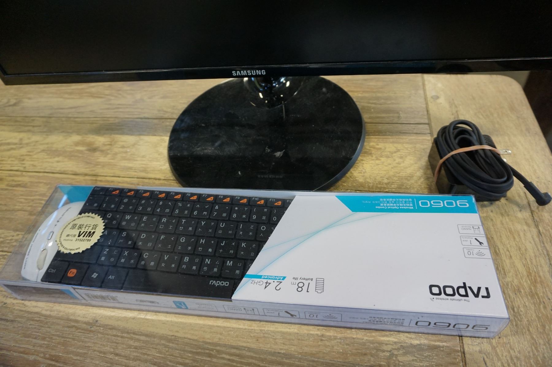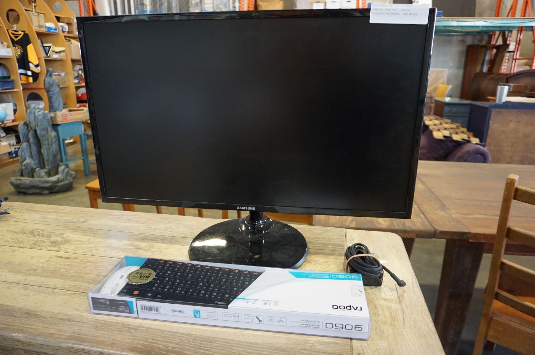 SAMSUNG MONITOR, CHARGER, WIRELESS KEYBOARD, AND MOUSE