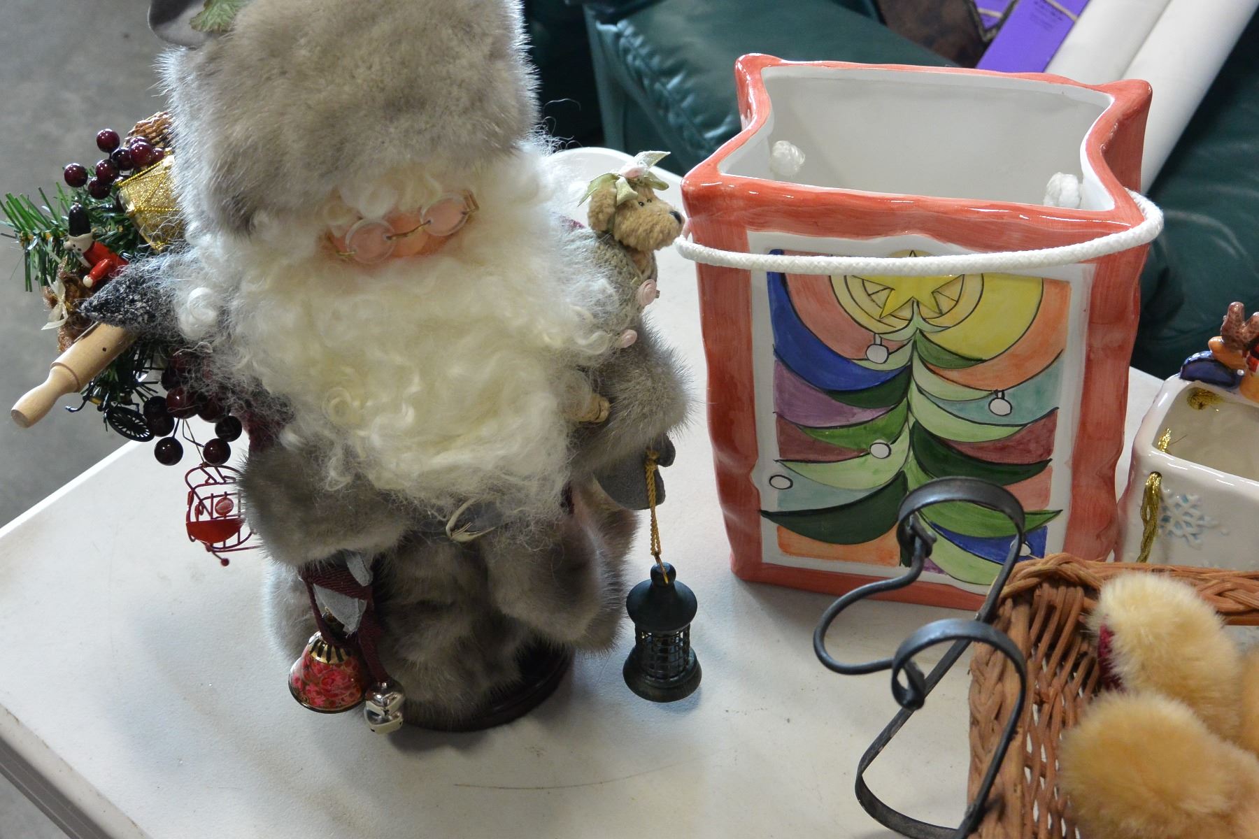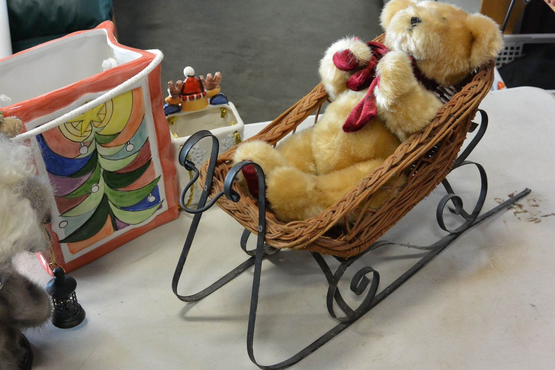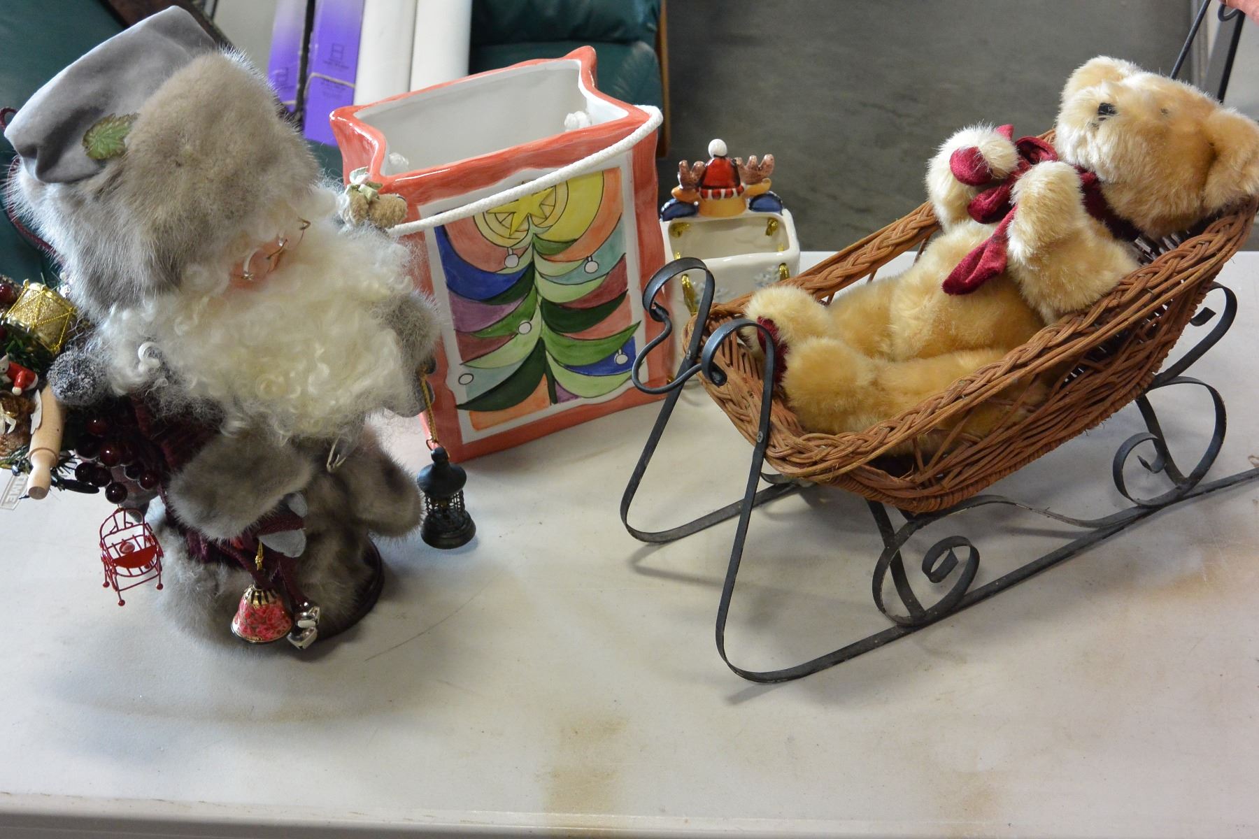 SANTA FIGURE, SLEIGH AND TWO CHRISTMAS VASES