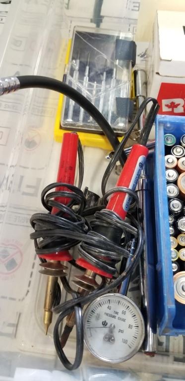 SAUDERING IRONS, SCREWDRIVER SET, SMALL MOTOT, PRESSURE GAUGE AND "AA" AND "AAA" BATTERIES