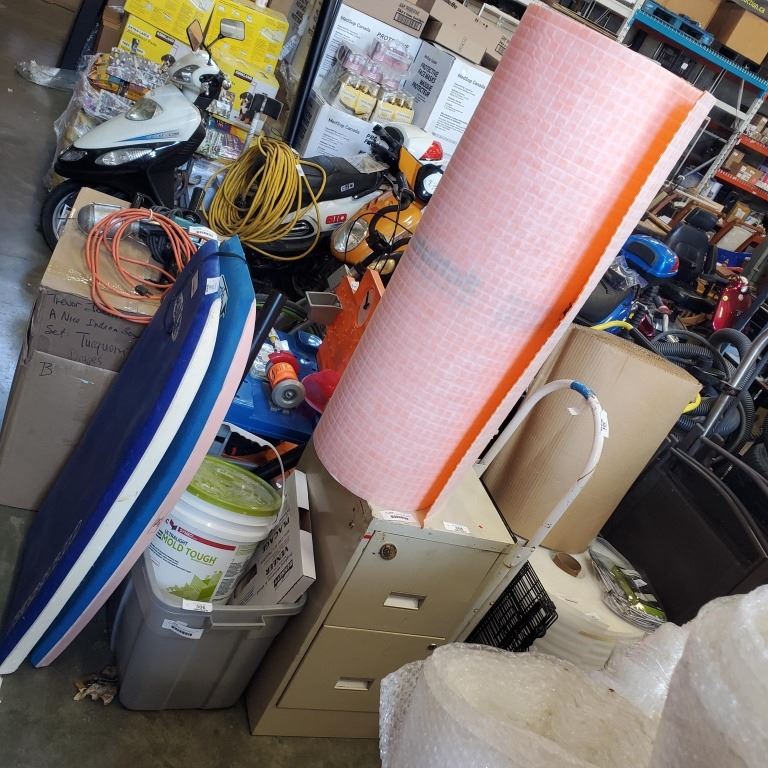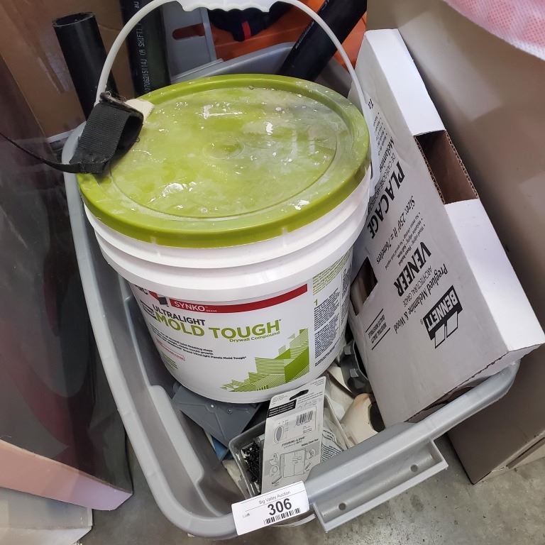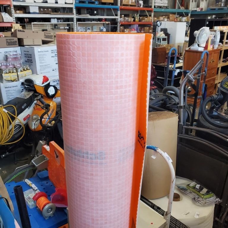 SCHLUETER UNDERLAYMENT AND TOTE WITH ASSORTED BUILDING SUPPLIES