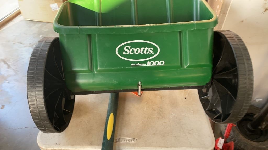 SCOTTS LAWN SPREADER, AXE, SPLITTING MAUL, SAW AND 3 DRAWER MESH ORGANIZER